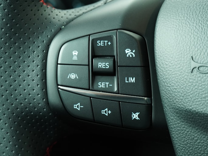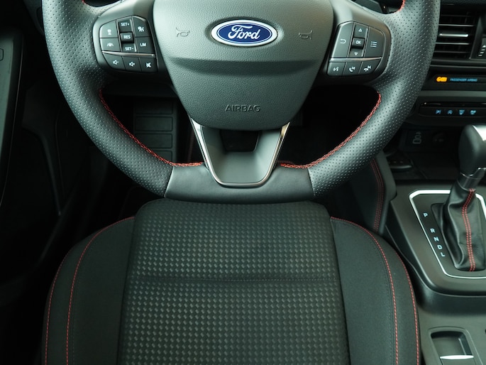 De Ford Focus ST-Line is de sportieve tak van de Focus-familie. Aan de sportieve bumpers, sideskirts en lichtmetalen velgen is meteen te zien dat dit geen standaard Focus is. Het onderstel is ook aangepast en 1 cm verlaagd voor een nog betere wegligging. Net zoals de meer standaardauto's biedt deze Focus een zee van ruimte. Op de achterbank is genoeg ruimte om als volwassene achter jezelf te kunnen zitten. De bekleding is uitgevoerd in zwart stof met prachtige rode stiksels. Deze auto is bovendien geleverd met verlengde fabrieksgarantie tot januari 2029, wat betekent dat u nog jarenlang kunt genieten van zorgeloos rijplezier, volledig gedekt door Ford zelf.