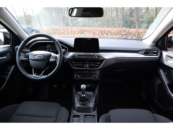 Niets achter deze auto blijft verborgen door de achteruitrijcamera. Een veilig gevoel! Deze Ford Focus is voorzien van remote services. Via uw smartphone bedient u diverse functies ook op afstand en krijgt u informatie over de status van uw auto. Met spraakbediening of de knoppen op het stuur regelt u het audiosysteem en het full map navigatiesysteem, terwijl u uw blik op de weg gericht houdt. De audio-installatie biedt daarbij glasheldere ontvangst dankzij DAB-ontvangst. Is uw smartphone geschikt voor snoerloos opladen? Dan zorgt de draadloze oplaadmogelijkheid voor telefoons weer voor een volle accu zonder snoeren en stekkers. Onbedoeld snijden na het inhalen gebeurt niet meer, dankzij de achteropkomend verkeer waarschuwing. De Ford is standaard voorzien van: WIFI-hotspot, automatische airconditioning, regensensor, cruise control, keyless entry en automatisch dimmende binnenspiegel.