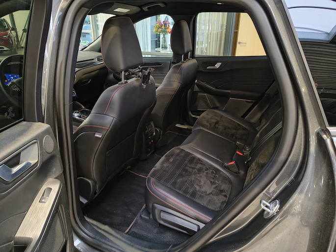 De Kuga is de ST-Line uitvoering. Dat is de sportieve variant van de Kuga. Zo is de auto rondom voorzien van sportieve bumpers, sideskirts en speciale bekleding met rode stiksels.