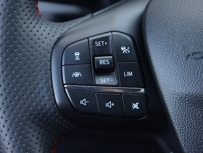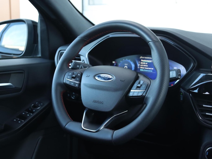Het digitale dashboard geeft alle up-to-date info en functies voor een slimme en veilige rit. Dankzij de 360 graden camera kunt u zowel de voor- als achterzijde van het voertuig in het oog houden, wat bijdraagt aan een veiligere rijervaring. Adaptive cruise control is een comfortabele en veilige optie. Het systeem reguleert de snelheid en houdt automatisch afstand tot uw voorligger. Locatie, motorconditie, storingen... via Connected Services krijgt u alle vitale info over de auto door. Ook handig bij pech! Voor een veilige rit is het belangrijk dat uw handen het stuur vasthouden en uw ogen gefocust blijven op de weg; daarom kunt u het audiosysteem, met DAB-ontvangst en full map navigatiesysteem bedienen met het stuurwiel of via spraakbediening. De Ford is standaard voorzien van: WIFI-hotspot, achteropkomend verkeer waarschuwing, automatische airconditioning, draadloos opladen, regensensor en sportstuurwiel.