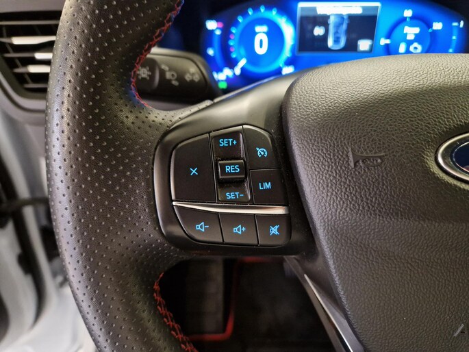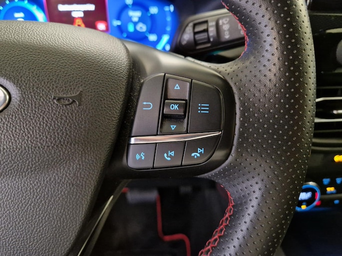 Het systeem controleert alle belangrijke functies en geeft die perfect weer via het digitale dashboard. Zelfs een kleine aanrijding kan flinke kosten veroorzaken. Gelukkig laat de achteruitrijcamera precies zien wat er zich achter de auto bevindt en geeft een waarschuwingssignaal. De auto is voorzien van een trekhaak en is een uitstekende caravantrekker. Zoals u van zo'n jonge auto mag verwachten, zijn hier ook de geavanceerde remote services aanwezig. Simpelweg met een app op uw smartphone controleert u op afstand de status van de auto en bedient u diverse functies. Deze Ford is voorzien van spraakbediening voor het full map navigatiesysteem en voor het audiosysteem met DAB-ontvangst. Maar u kunt ook de knoppen op het stuur gebruiken. De uitrusting van deze Ford is met automatische airconditioning, regensensor, cruise control, sportstuurwiel, keyless entry en automatisch dimmende binnenspiegel behoorlijk compleet.