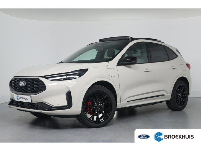 Ford huldigt het principe 'Go Further'. En dat betrekken ze ook op hun auto's zelf. Zuinig in brandstof, innovatieve toepassingen - Ford heeft veel te bieden. Deze nieuwe auto is nu uit voorraad leverbaar. Deze Ford Kuga is vanwege de hybride motor een echte slimmerd. Want u rijdt zowel op brandstof als elektrisch. En dat scheelt in de kosten! Licht en lucht komen onbelemmerd binnen als u het elektrisch bediende glazen panorama dak met één druk op de knop opent. En net zo gemakkelijk gaat de elektrisch bedienbare achterklep open. U past de stoelen moeiteloos aan, ze zijn elektrisch in te stellen en hebben bovendien een geheugen. Zelfs op de koudste dagen zorgt het verwarmbare stuurwiel, de voorstoelen en de achterbankverwarming ervoor dat u en uw passagiers het nooit koud hebben in deze luxueuze auto. Verblinding van tegenliggers is er niet meer bij, dankzij de koplampen met matrix LED-verlichting. En toch de kwaliteit van daglicht in het donker! Bij de rijke uitrusting horen ook 20 inch lichtmetalen velgen, sportonderstel, geluidsisolerende ramen, in delen neerklapbare achterbank, LED-achterlichten en sportuitlaat. Alle functies voor een veilige en zuinige rit worden overzichtelijk weergegeven op het digitale dashboard. Of u nu achteruit rijdt, parkeert of een smalle straat inslaat, de 360 graden camera op deze auto, mogelijk gemaakt door vier camera's, biedt een perfect beeld van uw omgeving. Adaptive cruise control houdt de ingestelde snelheid vast en houdt afstand tot het voertuig voor u. Mocht zich een probleem voordoen, dan krijgt u via remote services op uw smartphone te zien wat er precies aan de hand is, waar u ook bent. Het high performance audiosysteem is volledig afgestemd op de akoestiek van de auto; genieten dus! Met dashboard met spraakbediening, full map navigatiesysteem, kruisend verkeer detectie, automatische airconditioning, draadloos opladen en DAB ontvangst is deze auto helemaal compleet. Geavanceerde veiligheidssystemen kijken tijdens elke rit met u mee en schatten continu de risico's in. Een belangrijke bijdrage aan de veiligheid onderweg levert de verkeersbord-detectie in deze Ford. Ongemerkt buiten de rijstrook raken? Nee hoor, het Lane-keeping systeem waarschuwt en corrigeert. Op een kop-staartbotsing zit niemand te wachten. Daarom is de forward collision warning onderweg constant alert en berekent via een sensor de veilige afstand tot voorliggers. Ook helpen het dodehoekdetectie, hill hold functie, vermoeidheidsherkenning, frontale botsbescherming en bandenspanningcontrolesysteem, uw rit tot een veilige rit te maken. Natuurlijk is dit een splinternieuwe auto en hij wordt dus geleverd met volledige fabrieksgarantie. Daarbij kunnen we u verschillende gunstige financieringsvormen aanbieden. We maken graag een afspraak met u.