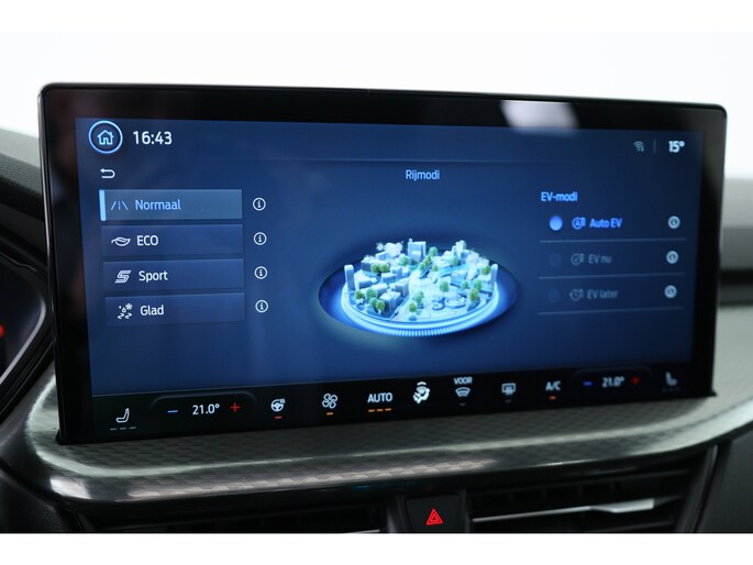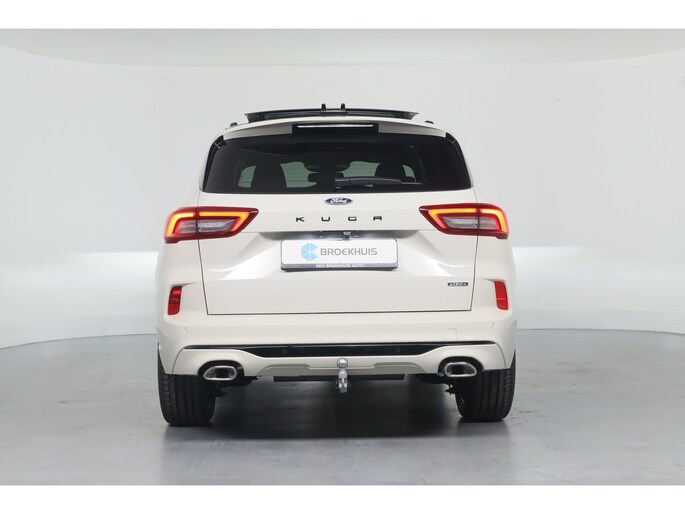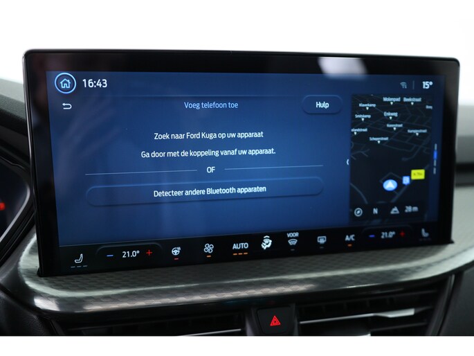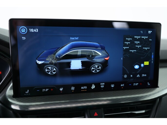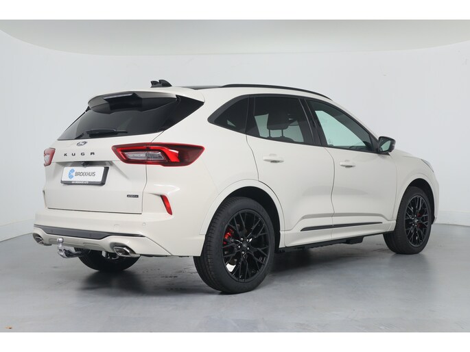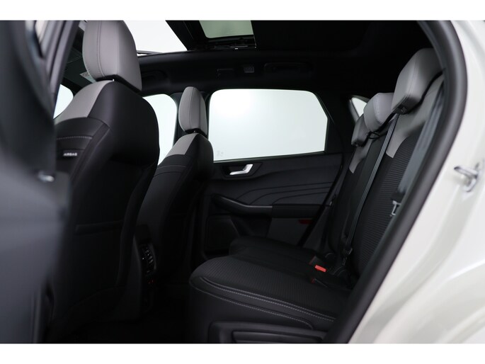 Ford huldigt het principe 'Go Further'. En dat betrekken ze ook op hun auto's zelf. Zuinig in brandstof, innovatieve toepassingen - Ford heeft veel te bieden. Deze nieuwe auto is nu uit voorraad leverbaar. Deze Ford Kuga is vanwege de hybride motor een echte slimmerd. Want u rijdt zowel op brandstof als elektrisch. En dat scheelt in de kosten! Licht en lucht komen onbelemmerd binnen als u het elektrisch bediende glazen panorama dak met één druk op de knop opent. En net zo gemakkelijk gaat de elektrisch bedienbare achterklep open. U past de stoelen moeiteloos aan, ze zijn elektrisch in te stellen en hebben bovendien een geheugen. Zelfs op de koudste dagen zorgt het verwarmbare stuurwiel, de voorstoelen en de achterbankverwarming ervoor dat u en uw passagiers het nooit koud hebben in deze luxueuze auto. Verblinding van tegenliggers is er niet meer bij, dankzij de koplampen met matrix LED-verlichting. En toch de kwaliteit van daglicht in het donker! Bij de rijke uitrusting horen ook 20 inch lichtmetalen velgen, sportonderstel, geluidsisolerende ramen, in delen neerklapbare achterbank, LED-achterlichten en sportuitlaat. Alle functies voor een veilige en zuinige rit worden overzichtelijk weergegeven op het digitale dashboard. Of u nu achteruit rijdt, parkeert of een smalle straat inslaat, de 360 graden camera op deze auto, mogelijk gemaakt door vier camera's, biedt een perfect beeld van uw omgeving. Adaptive cruise control houdt de ingestelde snelheid vast en houdt afstand tot het voertuig voor u. Mocht zich een probleem voordoen, dan krijgt u via remote services op uw smartphone te zien wat er precies aan de hand is, waar u ook bent. Het high performance audiosysteem is volledig afgestemd op de akoestiek van de auto; genieten dus! Met dashboard met spraakbediening, full map navigatiesysteem, kruisend verkeer detectie, automatische airconditioning, draadloos opladen en DAB ontvangst is deze auto helemaal compleet. Geavanceerde veiligheidssystemen kijken tijdens elke rit met u mee en schatten continu de risico's in. Een belangrijke bijdrage aan de veiligheid onderweg levert de verkeersbord-detectie in deze Ford. Ongemerkt buiten de rijstrook raken? Nee hoor, het Lane-keeping systeem waarschuwt en corrigeert. Op een kop-staartbotsing zit niemand te wachten. Daarom is de forward collision warning onderweg constant alert en berekent via een sensor de veilige afstand tot voorliggers. Ook helpen het dodehoekdetectie, hill hold functie, vermoeidheidsherkenning, frontale botsbescherming en bandenspanningcontrolesysteem, uw rit tot een veilige rit te maken. Natuurlijk is dit een splinternieuwe auto en hij wordt dus geleverd met volledige fabrieksgarantie. Daarbij kunnen we u verschillende gunstige financieringsvormen aanbieden. We maken graag een afspraak met u.