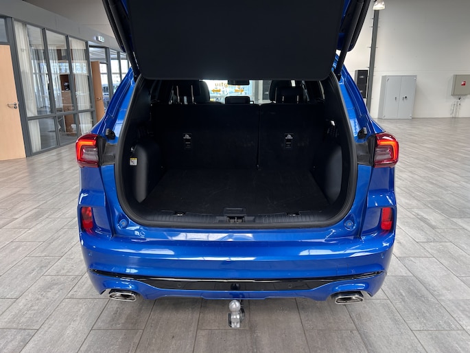 De trekhaak is in de fabriek al gemonteerd. Met een knopje in de bagageruimte komt de trekhaak volledig elektrisch tevoorschijn. De aansluiting voor de verlichting zit mooi onder handbereik aan de zijkant van de trekhaak. Door de 243 pk sterke aandrijflijn en de indrukwekkende wegligging mag de Kuga maar liefst 2100 kg trekken. De maximale kogeldrug is 100 kg. 2 (of 3) e-bikes meenemen is dus ook geen enkel probleem.