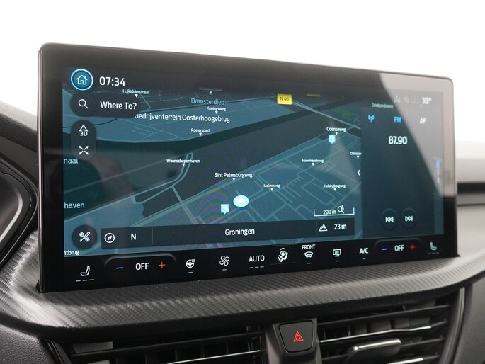 Centraal op het dashboard bevindt zich het grote touchscreen infotainmentsysteem. Hiermee heeft u toegang tot navigatie, bluetooth en uiteraard draadloos Apple CarPlay en Android Auto. Uw smartphone koppelt automatisch zodra u instapt, zodat u apps zoals Google Maps, Spotify of WhatsApp veilig en overzichtelijk op het scherm kunt bedienen. Doordat de verbinding draadloos is, hoeft u uw telefoon niet meer uit uw zak te halen.