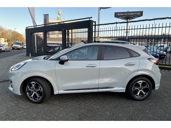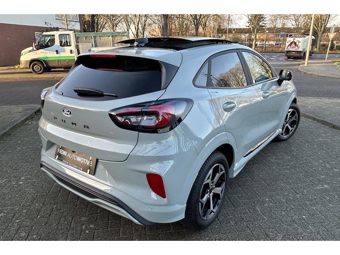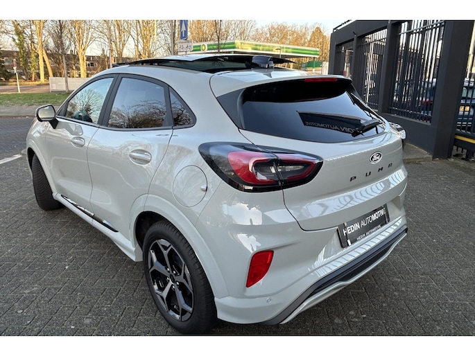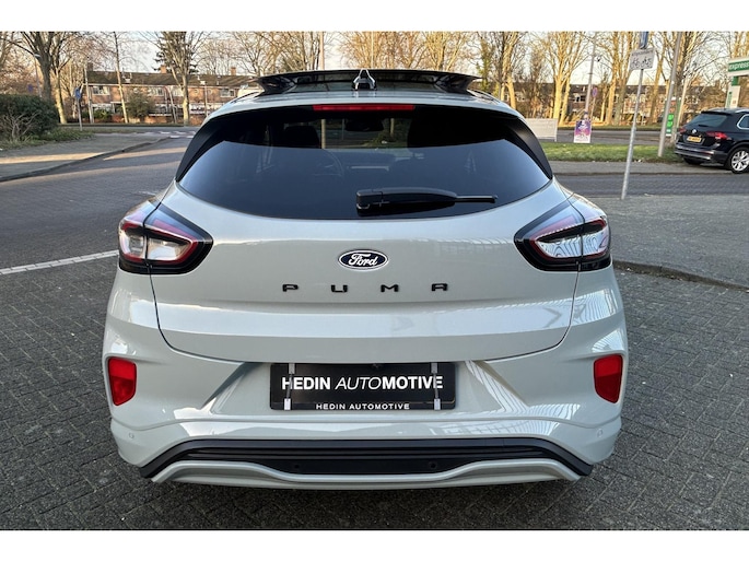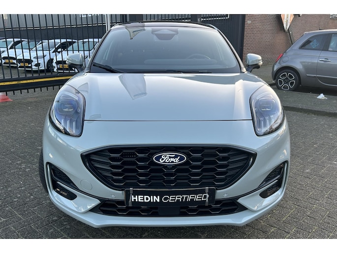 Hij is stijlvol en comfortabel, deze Ford Puma, en hij is ontworpen om jou veilig en comfortabel te laten rijden onder alle omstandigheden. De aandrijving van deze Ford wordt verzorgd door een driecilinder benzinemotor en een automatische transmissie. Voorin is het 's winters genieten met de verwarmbare voorstoelen voor zowel bestuurder als bijrijder. In deze sportstoelen voel je je één met je auto. De elektrische achterklep opent met een druk op de knop, zodat jij gemakkelijk toegang heeft tot de bagageruimte. Het glazen panoramadak laat jou genieten van een wijds uitzicht en meer lichtinval. Het verwarmbare stuurwiel is een teken van ultieme luxe. Deze voorziening is een topklasse auto waardig. Bij de rijke uitrusting horen ook Full LED koplampen, sportonderstel, extra getint glas, in delen neerklapbare achterbank, LED-achterlichten en verstelbare lendensteunen.