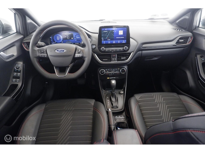 Sportieve en leuk uitgevoerde Ford Puma 1.0 EcoBoost Hybrid Automaat (7-Traps) ST-Line met Comfort-, Driver Assistance- en Winter Pack met o.a. Elektrisch Glazen Panoramadak, 1/2 Lederen Bekleding met Stoel- en Stuur Verwarming, Matrix Led Koplampen met Grootlicht Assistent en Volledige Led Verlichting, Volledig Digitaal Instrumenten Paneel, Navigatie, Bluetooth Telefoon met Multimedia Systeem en Draadloos Opladen, DAB Radio met Mirror Link Apple Carplay en Android Auto, Vol Automatische Airco met Elektrische Verwarmde Voorruit, Donkere Hemelbekleding, Rijstrook Assistent met Correctie, Achteruitrijcamera met Parkeer Assistent en Parkeersensoren Voor en Achter Dodehoek Detectie, Elektrisch Bedienbare Achterklep en 18 Inch Lichtmetalen Velgen.