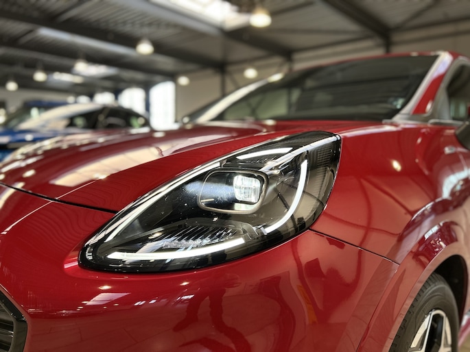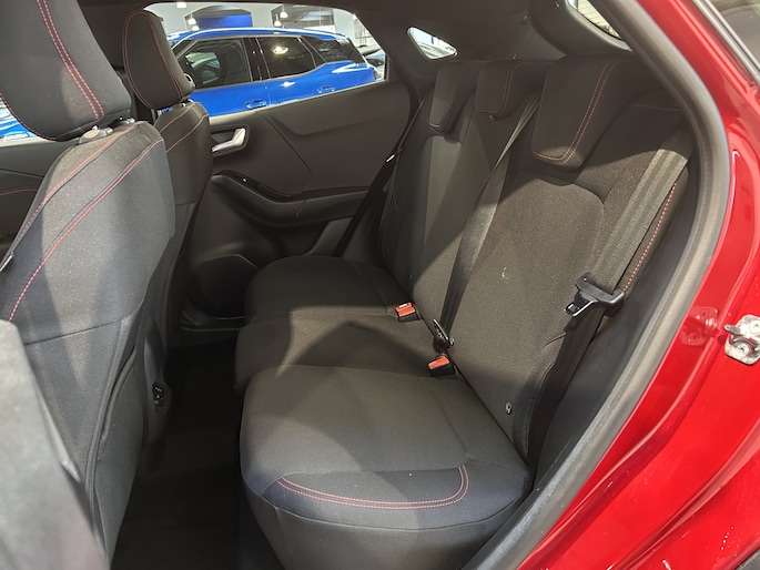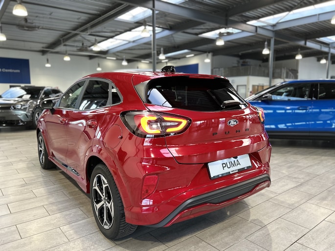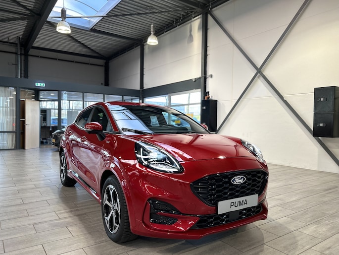 Maak kennis met de Ford Puma. Fords compacte cross-over SUV. Compact van buiten en ruim van binnen. De sportieve lijnen en de aflopende daklijn laten zien dat de Puma een sportieve auto is. Door de hoge zit is het instappen erg gemakkelijk. Wist u dat de kofferbak van de Puma groter is dan de bagageruimte van de Ford Focus? De ST-Line uitvoering is de sportieve tak van de familie. Een subtiel verlaagd onderstel, speciale bumpers, sideskirts en velgen geven de auto een heel andere uitstraling. Ook vering en demping is aangepast waardoor de wegligging nog beter is dan de standaard Focus. Ook van binnen ziet de auto er sportiever uit. Zwarte hemelbekleding en rode stiksels geven ook het interieur een sportieve uitstraling. Daarnaast is deze Puma voorzien van hybride techniek. De mild-hybride technologie omvat een elektromotor die helpt de efficiency te verbeteren.