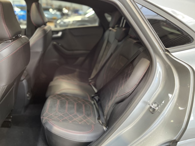 Maak kennis met de Ford Puma. Fords compacte cross-over SUV. Compact van buiten en ruim van binnen. De sportieve lijnen en de aflopende daklijn laten zien dat de Puma een sportieve auto is. Door de hoge zit is het instappen erg gemakkelijk. Wist u dat de kofferbak van de Puma groter is dan de bagageruimte van de Ford Focus? De ST-Line uitvoering is de sportieve tak van de familie. Een subtiel verlaagd onderstel, speciale bumpers, sideskirts en velgen geven de auto een heel andere uitstraling. Ook vering en demping is aangepast waardoor de wegligging nog beter is dan de standaard Focus. Ook van binnen ziet de auto er sportiever uit. Zwarte hemelbekleding en rode stiksels geven ook het interieur een sportieve uitstraling. Daarnaast is deze Puma voorzien van hybride techniek. De mild-hybride technologie omvat een elektromotor die helpt de efficiency te verbeteren.