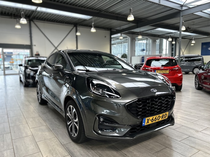 Maak kennis met de Ford Puma. Fords compacte cross-over SUV. Compact van buiten en ruim van binnen. De sportieve lijnen en de aflopende daklijn laten zien dat de Puma een sportieve auto is. Door de hoge zit is het instappen erg gemakkelijk. Wist u dat de kofferbak van de Puma groter is dan de bagageruimte van de Ford Focus? Daarnaast is deze Puma voorzien van hybride techniek. De mild-hybride technologie omvat een elektromotor die helpt de efficiency te verbeteren, in combinatie met zijn automatische versnellingsbak zorgt dit voor een comfortabele en pittige rijervaring.