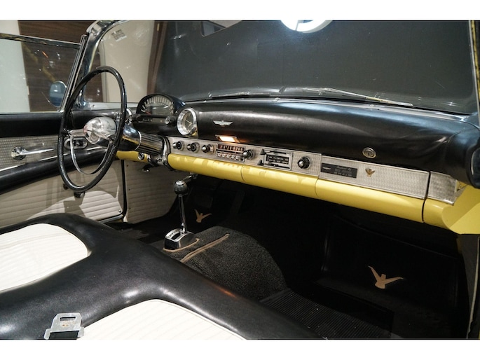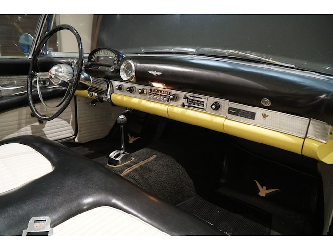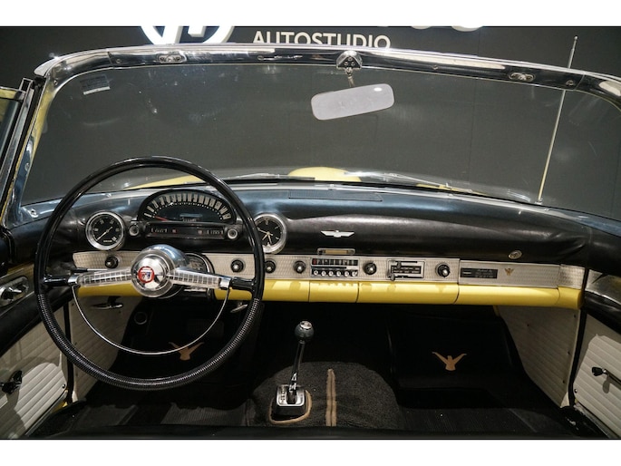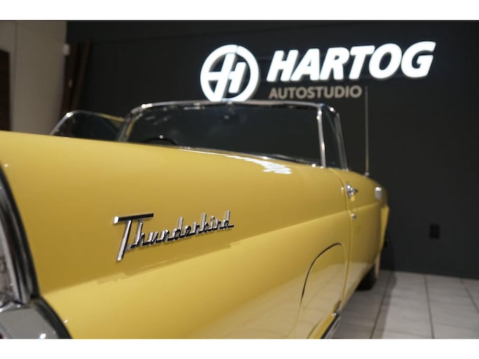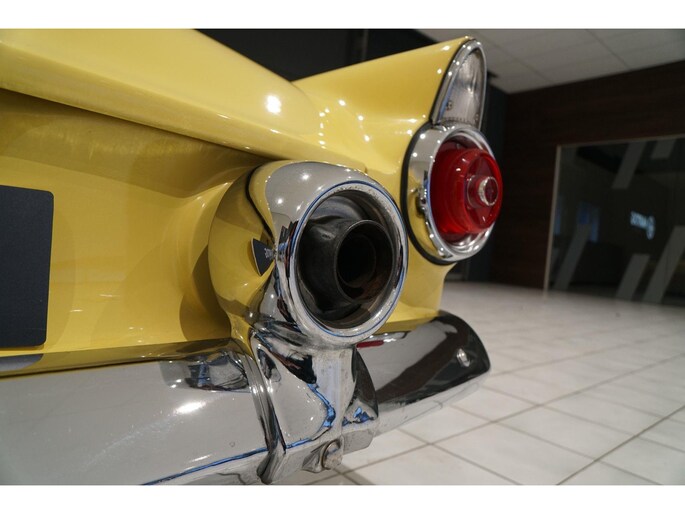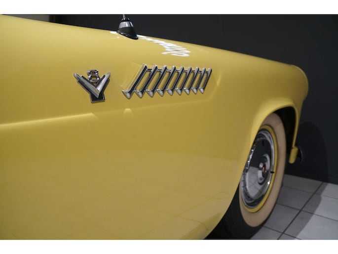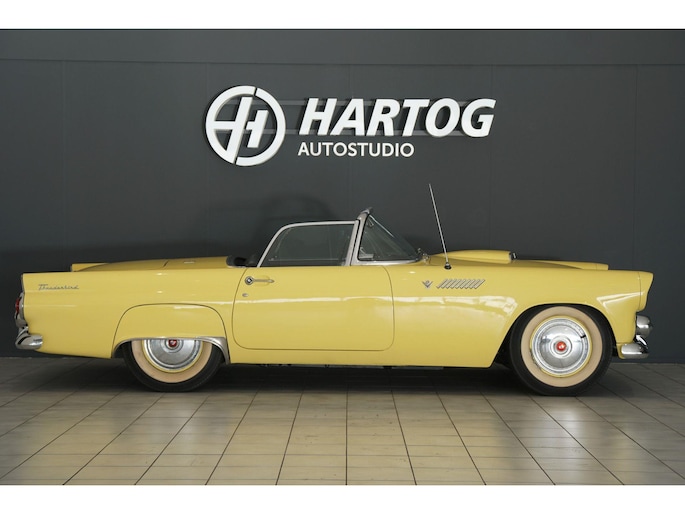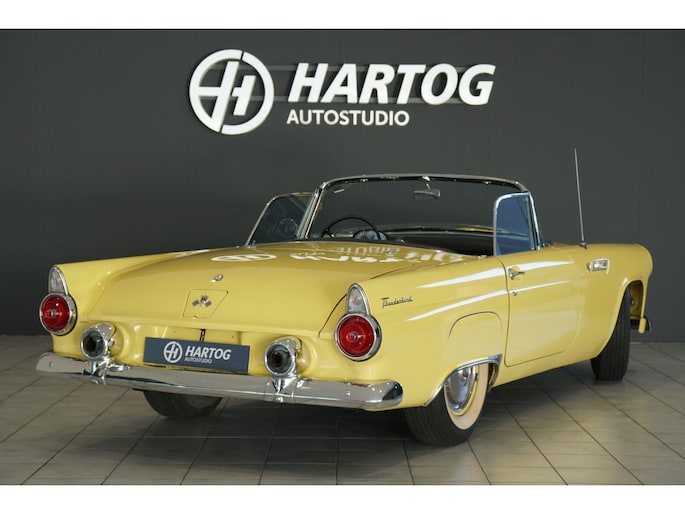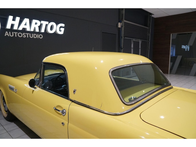 Allereerste generatie Thunderbird, De allereerste Thunderbird is namelijk gebouwd in 1955 en dat is ook het bouwjaar van deze auto (productie gestart in oktober 1954 maar als modeljaar 1955). De productiedatum van deze auto is 17 juli 1955. Dit modeljaar 1955 heeft de 292 cubic inch OHV 292 Y-Block V8 met 4778 cc en 198 PK / 148 PK. De handgeschakelde versie had 193 PK, maar bij deze Ford-o-matic automaatversie heeft een motor een hogere compressieverhouding van 8.5:1 in plaats van 8.1:1. Deze Thunderbird heeft een witte softtop (in goede staat) en een hardtop in carrosseriekleur met standaard voor de winterstalling. Deze gele carrosseriekleur heeft code V op het typeplaatje, dat staat voor Goldenrod Yellow. De interieurcode op het plaatje is A, dit is Black/White. De auto is dus nog in originele kleurstelling als vanaf fabriek. Deze auto hebben wij zelf recent geïmporteerd vanuit Florida, Amerika. Er is veel historie aanwezig, diverse facturen, en boekjes. Reservewiel, Afdekhoes, ook voor de hardtop. Origineel 45.628 miles gereden, Elektrisch systeem omgebouwd naar 12 Volt, Remmen omgebouwd naar schijfremmen voor + achter, In totaal slechts 3 eigenaren gehad. Totaal geen roest.