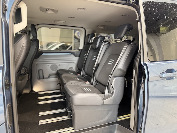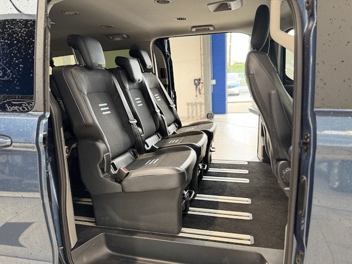Ook op het gebied van ruimte en flexibiliteit blinkt deze Tourneo uit. De afstand tussen de tweede en derde zitrij is verstelbaar, waardoor u eenvoudig extra beenruimte voor passagiers of juist meer bagageruimte kunt creëren. Zo past u het interieur moeiteloos aan uw situatie aan: maximaal comfort voor inzittenden of extra ruimte voor bagage, ideaal voor vakanties, zakelijk vervoer of dagelijks gebruik.