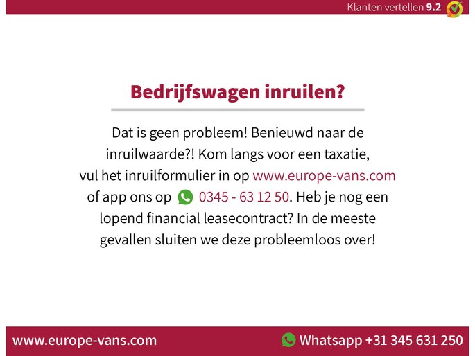 Inruil van uw huidige bedrijfswagen is mogelijk. Financial lease behoort tot de mogelijkheden, op onze site vindt u de tarieven en kunt u direct een aanvraag doen. Alle prijzen zijn exclusief 21% BTW tenzij anders vermeld. Informeer naar aanvullende voorwaarden bij particuliere verkoop. EXPORT: As official VWE-exportpartner we provide all needed documents and services.
