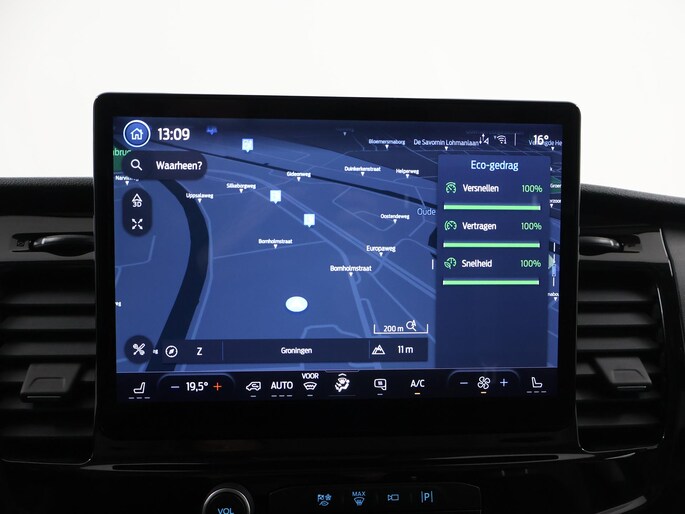 Go Further. Mooi motto van Ford. En ze maken het waar ook. Natuurlijk is de actieradius mede afhankelijk van de weersomstandigheden, maar een volle acculading is over het algemeen voldoende voor de gewone dagelijkse ritten. Het opladen kan gewoon 's nachts, terwijl u slaapt. De auto heeft een opmerkelijk lage kilometerstand van slechts 1633 De verwarmbare voorstoelen zijn een weldaad voor rug en schouders. Bij deze Ford E-Transit is aan alles gedacht, tot en met een verwarmd stuurwiel aan toe. Parkeerschade door openslaande deuren is er niet bij. De schuifdeur wordt dicht langs de zijkant geleid en uitstappen gaat supergemakkelijk.