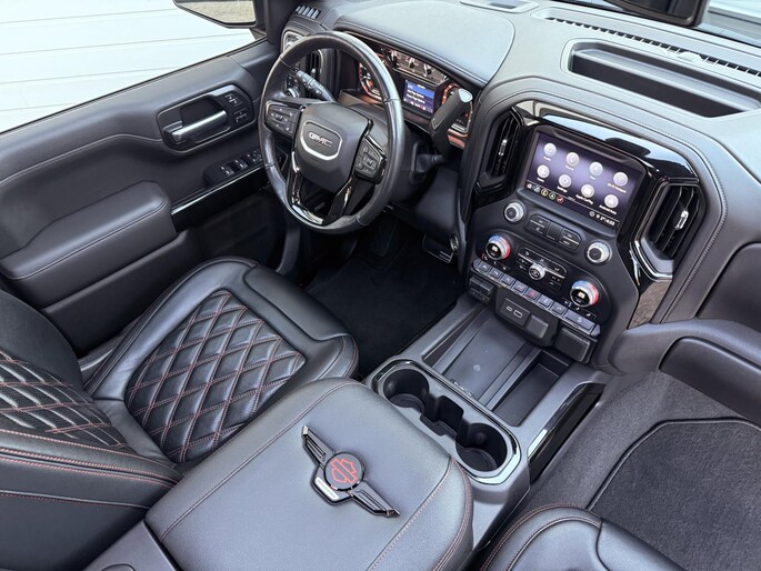 - Lederen Bekleding: Speciaal op maat gemaakt, gewatteerd en geperforeerd lederen interieur met oranje stiksels en ingebouwde Harley-Davidson schilden.