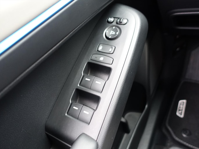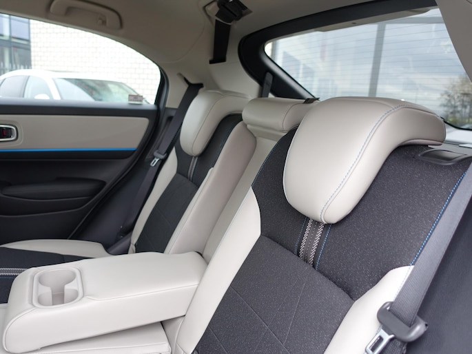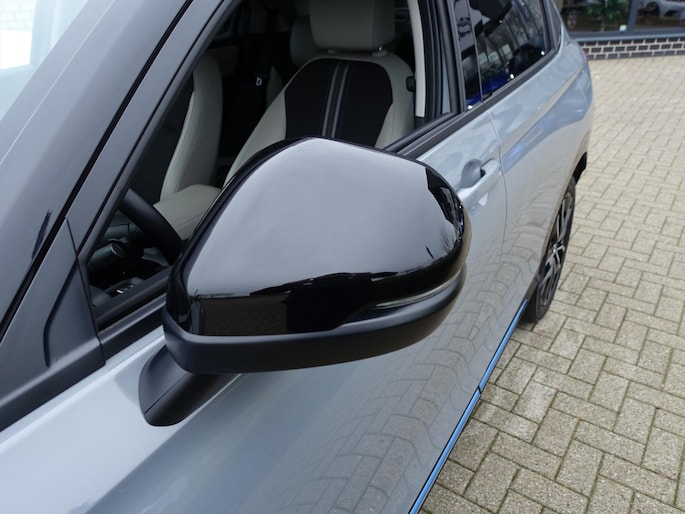 - Exclusieve styling: Glanzend zwarte afwerking op middenconsole vooraan, blauwe streep op deur en instrumentenpaneel, blauwe stiksels in stoelen