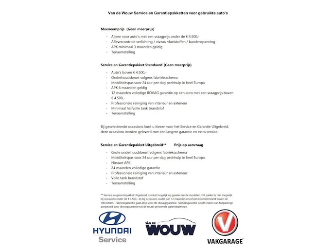 ** Service en garantiepakket Uitgebreid is enkel mogelijk op Hyundai en Mitsubishi modellen. Dit pakket is niet mogelijk bij occasions onder de € 4.500,- en bij occasions ouder dan 72 maanden en/of een kilometerstand boven de 100.000km. Fabrieksgarantie gaat altijd voor de Bovag garantie. Fabrieksgarantie wordt (indien van toepassing) aangevuld door Bovag garantie tot de totaal genoemde garantieperiode.
