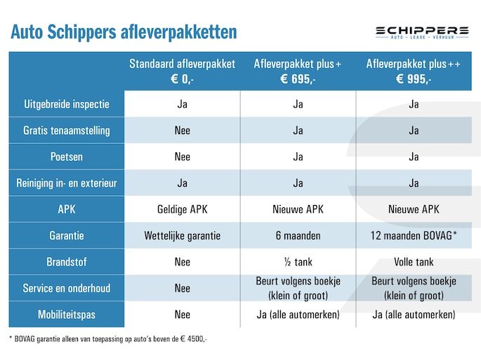 - Afleverpakket + (€ 695): Uitgebreide inspectie | Reiniging in- en exterieur | Nieuwe APK | 6 Maanden garantie | Beurt volgens boekje | Mobiliteitspas | Poetsen | Halve tank brandstof | Gratis tenaamstelling