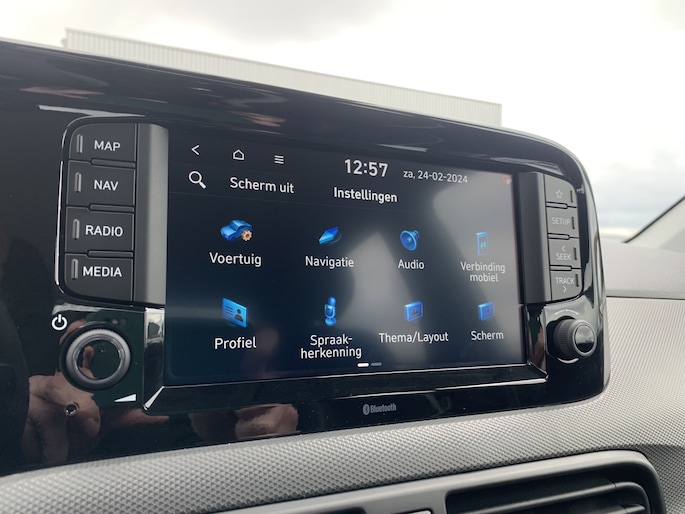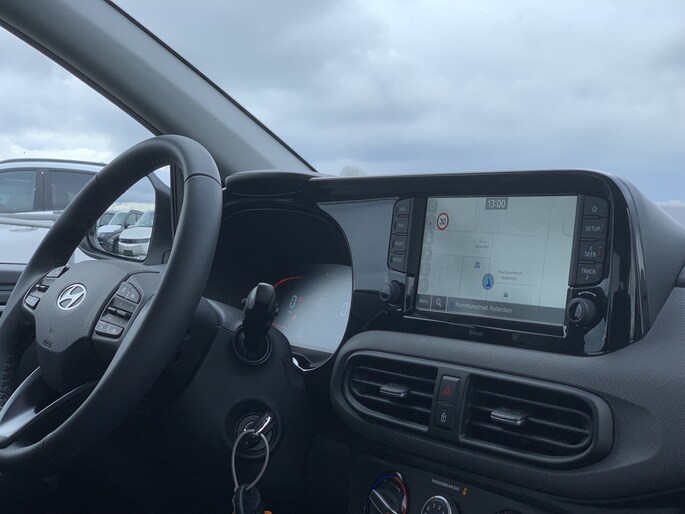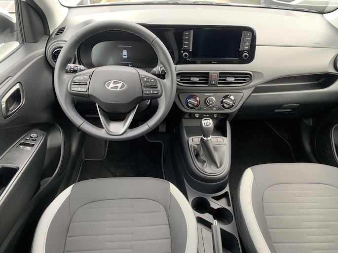 Zoals je mag verwachten van deze Hyundai i10 is hij uitgerust met een reeks aan actieve veiligheidssystemen. Wat deze auto ook kan, is lezen. Hij 'leest' voor jou de verkeersborden tijdens de rit en attendeert je erop door ze op het dashboard te projecteren. Het Lane-keeping systeem registreert permanent of je binnen de lijnen van de rijstrook blijft; dwaal je onbedoeld af, dan waarschuwt het systeem en corrigeert de koers. Onbedoeld bumperkleven is er niet bij, dankzij de forward collision warning. Die waarschuwt direct als een botsrisico met je voorligger dreigt. Ook helpen het hill hold functie, vermoeidheidsherkenning, autonoom remsysteem en bandenspanningcontrolesysteem, jouw rit tot een veilige rit te maken.