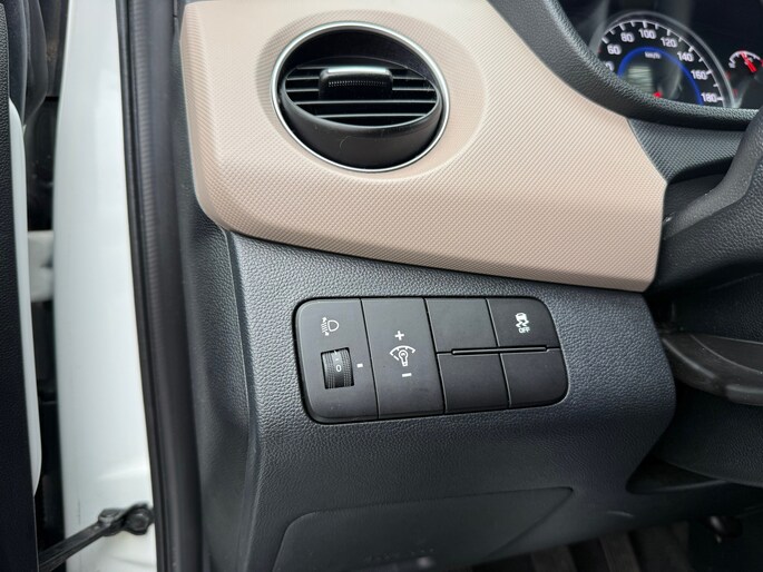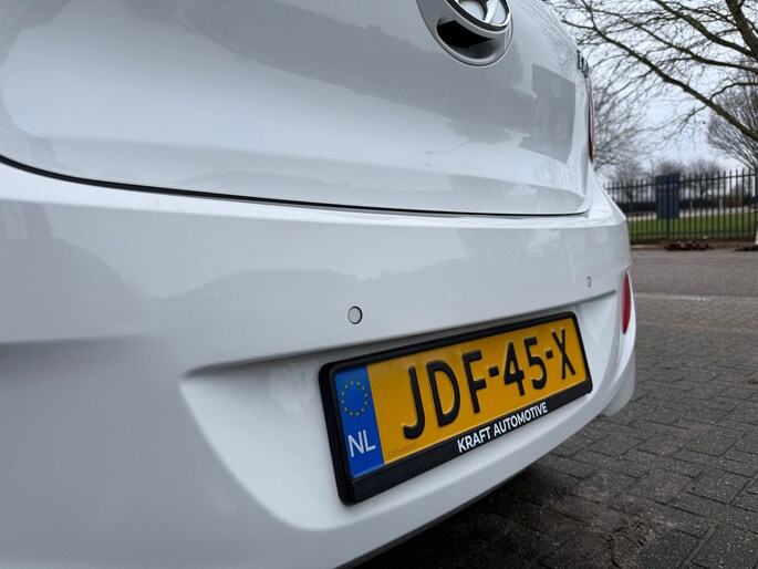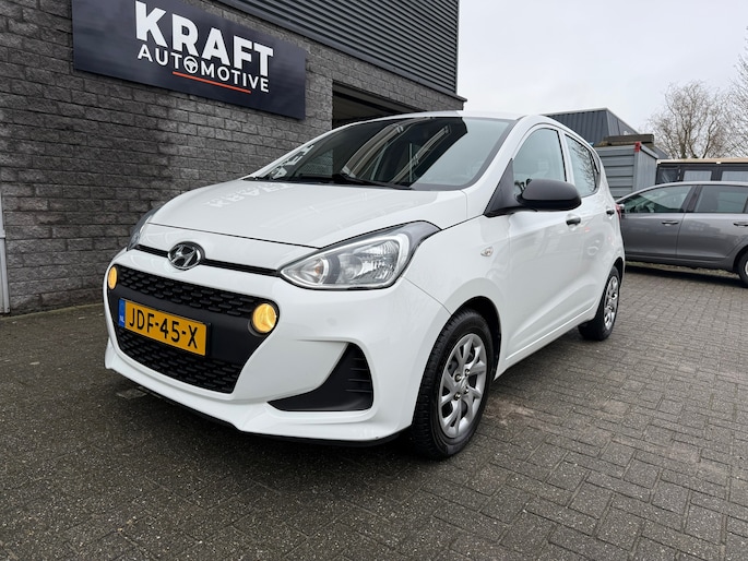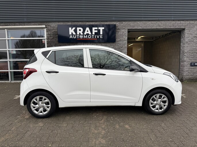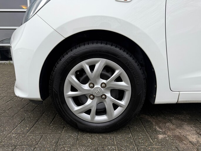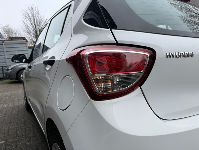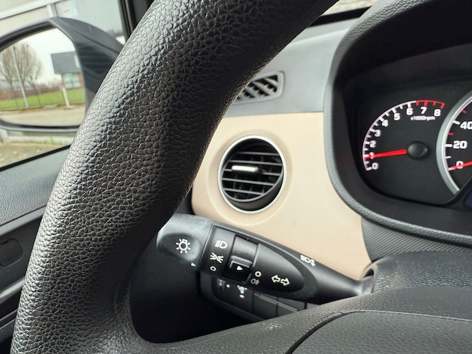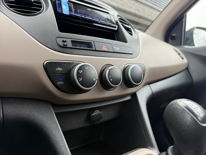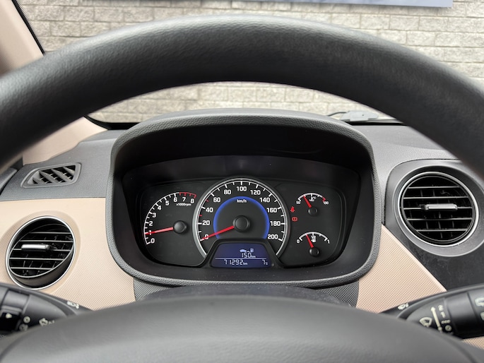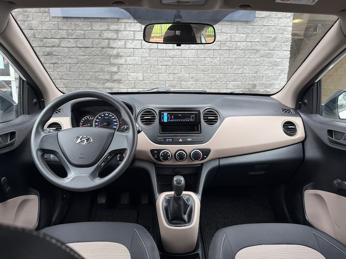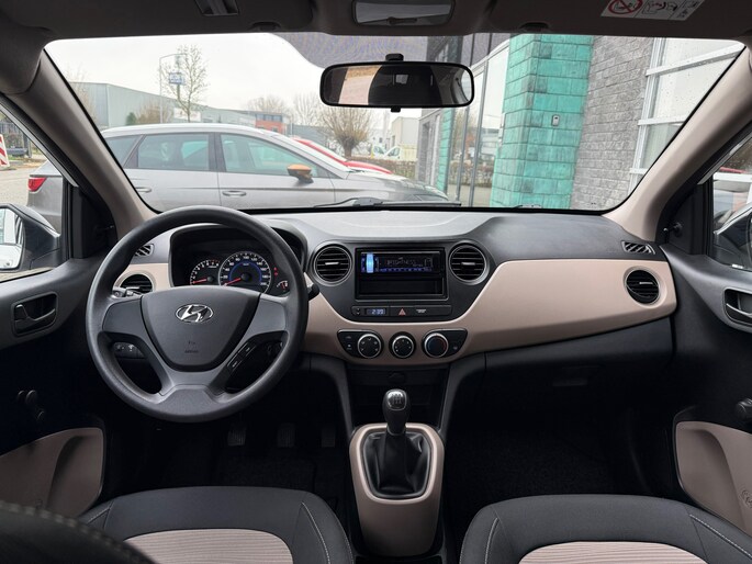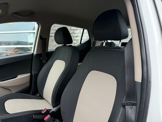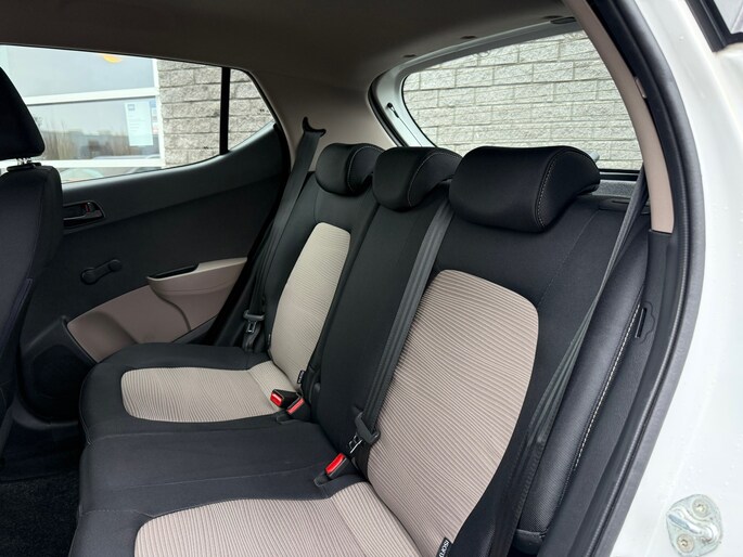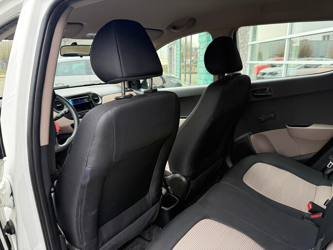 De i10 is uitgevoerd als 5-deurs, wat zorgt voor extra gebruiksgemak. Het interieur ziet er verzorgd uit en beschikt over een zwart stoffen interieur met stijlvolle crème accenten, wat de auto een frisse en moderne uitstraling geeft.