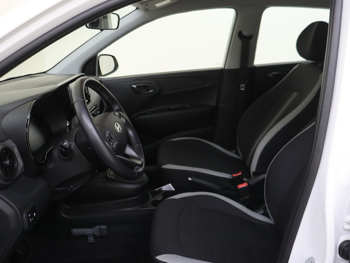 De Hyundai i10 is jouw trouwe partner onderweg, want hij houdt continu voor jou de situatie op en om de weg in de gaten. Volautomatische veiligheidssystemen kunnen daarbij ingrijpen om je voor gevaarlijke situaties te behoeden. Met het Lane-keeping systeem kom je nooit per ongeluk buiten de rijstrook. Mindert een voorligger onverwachts te veel vaart, dan komt de forward collision warning in actie en waarschuwt meteen. Een belangrijk veiligheidssysteem in deze auto is de vermoeidheidsherkenning, die je een duidelijk signaal geeft wanneer je achter het stuur in slaap dreigt te vallen. Je bent mede dankzij hill hold functie, autonoom remsysteem en bandenspanningcontrolesysteem steeds veilig onderweg.