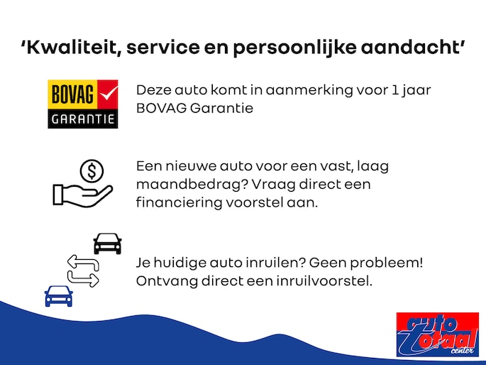 Afleveringsbeurt volgens onderhoudsschema fabrikant, Distributie vervangen indien nodig, 12 maanden Bovag Garantie, Nieuwe apk Keuring, Officiële RDW vrijwaring voor uw inruilauto.