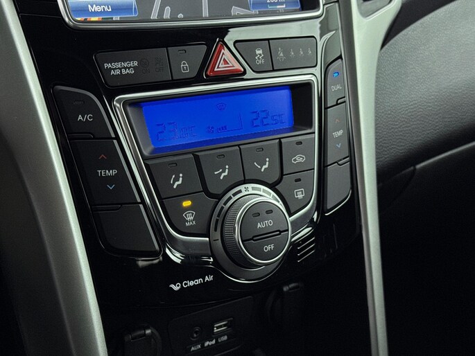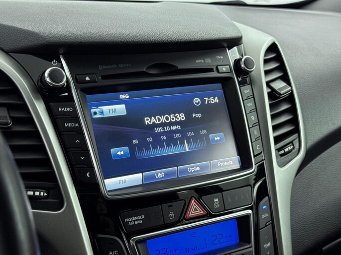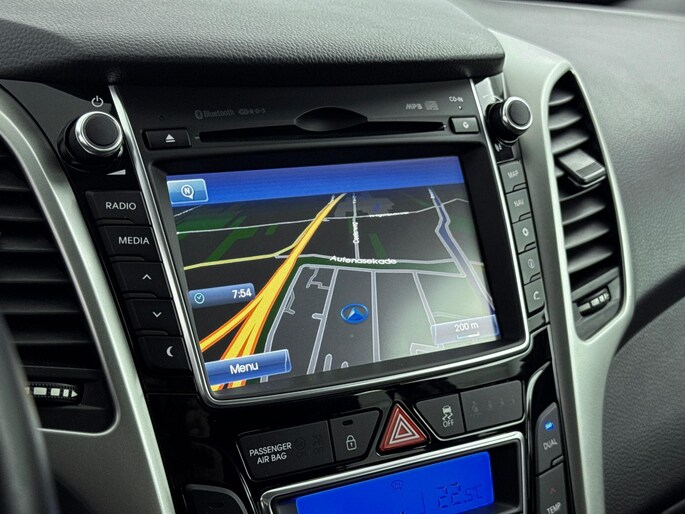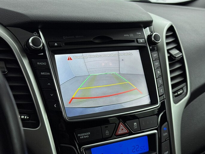 Alles vrij achter? De achteruitrijcamera laat het meteen zien. In deze i30 vind je schakelaars op het stuur om het audiosysteem te bedienen en het navigatiesysteem. Bij de luxe van deze auto hoort ook electronic climate control. Relaxt rijden is meegeleverd in de vorm van cruise control. Deze Hyundai is voorzien van automatisch dimmende binnenspiegel en centrale deurvergrendeling met afstandsbediening.