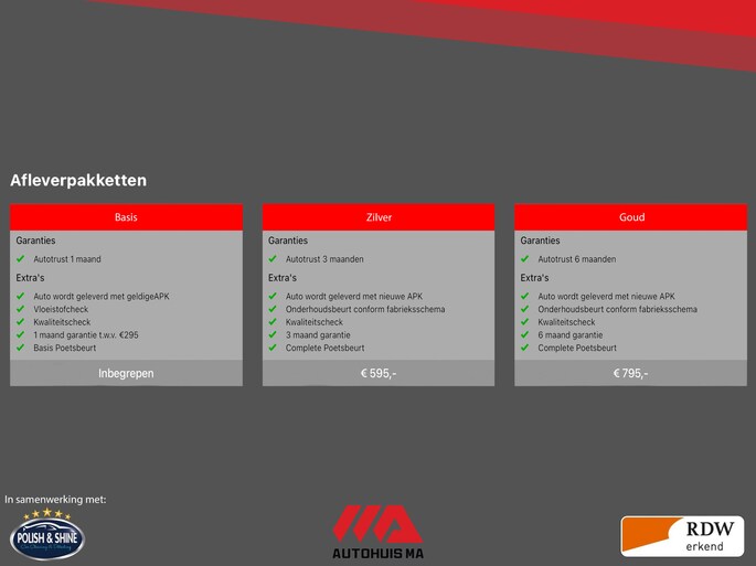 - Zilver (€ 595 meerprijs): Dit afleverpakket bevat (in plaats van afleverpakket "Basis"): Autotrust garantie; 3 maand garantie, Auto wordt geleverd met nieuwe APK, Complete Poetsbeurt, Kwaliteitscheck, Onderhoudsbeurt conform fabrieksschema