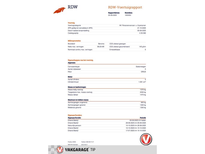 Een onderhoudsbeurt volgens schema of 12 maanden onderhoudsvrij (m.u.v dis) , een volledige car cleaning, minimaal 25.000 kilometer reserve op de distributieriem én minimaal 3 millimeter bandenprofiel, airconditioning gevuld en remvloeistof ververst, nieuwe ruitenwissers, minimaal 15 liter brandstof in de tank en 1 jaar Vakgarage pechhulp