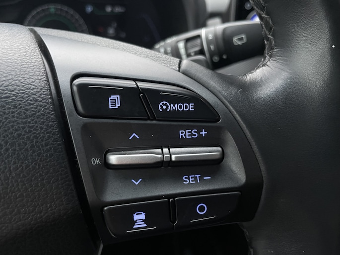 Zoals u mag verwachten van deze Hyundai Kona is hij uitgerust met een reeks aan actieve veiligheidssystemen. Bij de veiligheidssystemen van deze auto hoort ook de verkeersbord-detectie. Die leest tijdens het rijden als het ware met u mee en attendeert u op de significante verkeersborden langs en boven de weg. Het Lane-keeping systeem let constant op en waarschuwt of corrigeert als u onoplettend over de lijnen van de rijstrook gaat. Onbedoeld bumperkleven is er niet bij, dankzij de forward collision warning. Die waarschuwt direct als een botsrisico met uw voorligger dreigt. Verder is deze auto uitgerust met head-up display, dodehoekdetectie, hill hold functie, vermoeidheidsherkenning, autonoom remsysteem en bandenspanningcontrolesysteem.