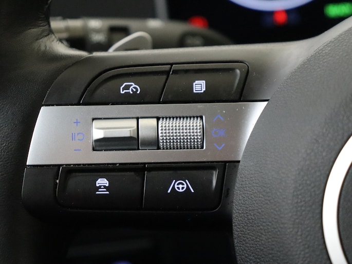Dankzij het digitale dashboard lees je alle benodigde info gemakkelijk en overzichtelijk af. Parkeer en kijk niet om! De achteruitrijcamera doet dat voor je. Met adaptive cruise control houdt de auto zelfstandig afstand tot jouw voorligger. Een veiligheidsverhogende optie waarmee je comfortabel onderweg bent. Kop aan kont langzaam rijden: dan is afstand houden soms lastig. De file assistent helpt en zorgt automatisch voor veilige ruimte tot de voorligger. Ook als die tot stilstand komt. Ingebouwde spraakbediening maakt het mogelijk om de auto te bedienen zonder dat jouw aandacht wordt afgeleid. Met connected drive services, premium audiosysteem, navigatiesysteem, automatische airconditioning, schakelpaddles aan het stuur en draadloos opladen is deze Hyundai helemaal compleet.