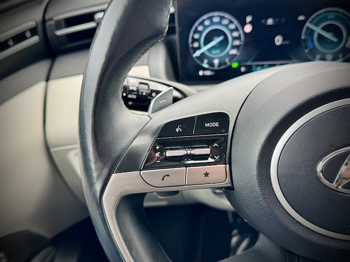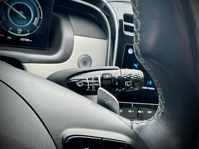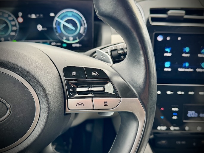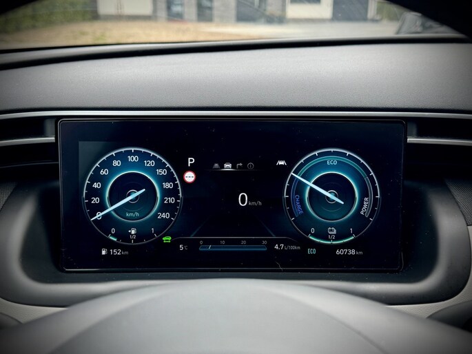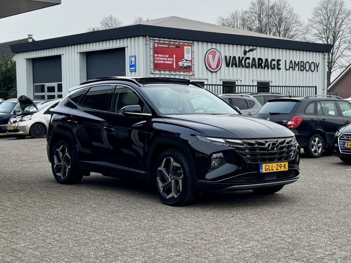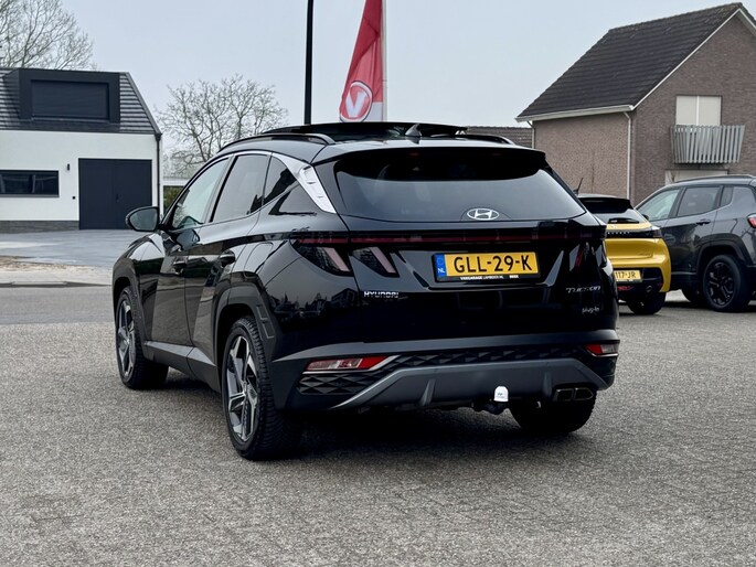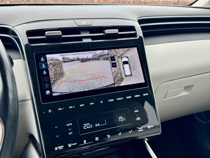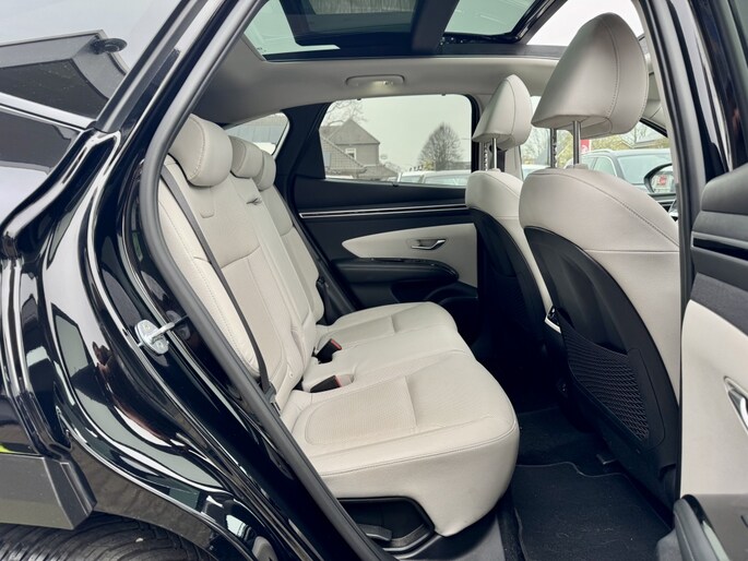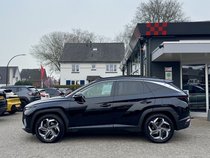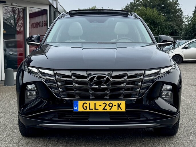 Rijden als nieuw? Dan is deze Hyundai Tucson een fantastische buitenkans. Prille cijfers op de teller, piepjong ogend, verbluffend actueel in extra's en opties... Deze Hyundai Tucson heeft het allemaal! Naast de verbrandingsmotor beschikt de auto ook over een elektromotor, die zorgt voor een extra laag brandstofverbruik. Tot wel 62km volledig elektrisch rijden! Hoge kwaliteit is ook binnenin aanwezig. Kijk maar naar de leren bekleding! Koude start? Niet met de verwarmbare voorstoelen! Volop licht en ruimtelijk gevoel geeft het elektrische bediende glazen panoramadak. Een praktische extra is de elektrisch bedienbare achterklep die opent en sluit met een druk op de knop. Waarom zou je alleen voorin behaaglijk mogen zitten? Daarom is er óók een verwarmde achterbank. In deze Hyundai profiteer jij onder andere ook van: 19 inch lichtmetalen velgen, LED koplampen, aluminium dakrailing, elektrisch inklapbare buitenspiegels, donker getint glas achter en in delen neerklapbare achterbank.
