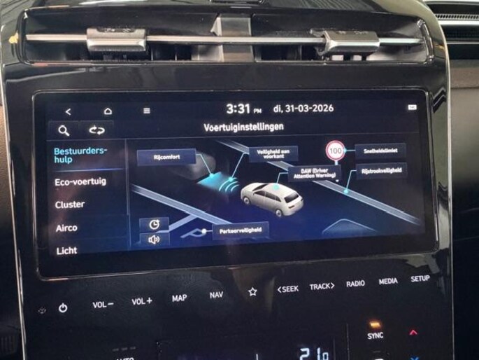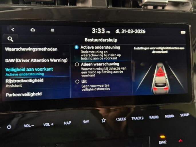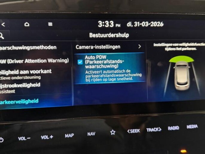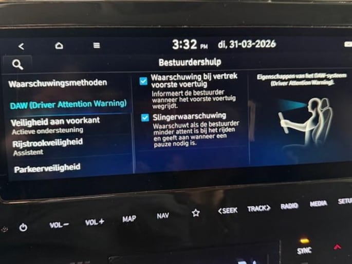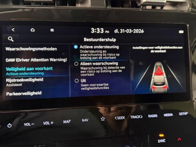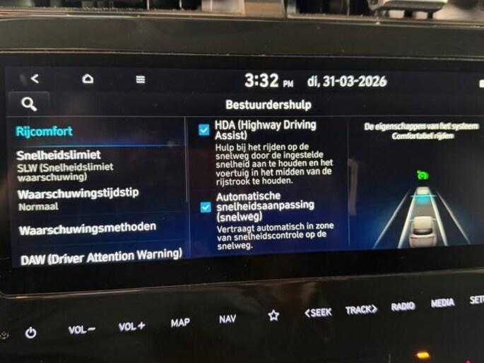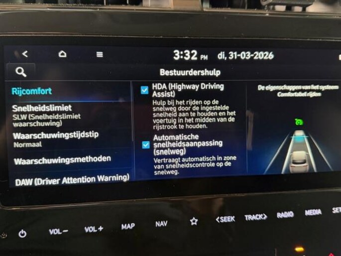 Aan boord van deze HYUNDAI houden verschillende geavanceerde systemen voor u de weg in de gaten. Ze waarschuwen u voor noodsituaties en kunnen in een aantal gevallen ook zelf ingrijpen. Onderweg zorgt verkeersborddetectie ervoor dat u geen waarschuwingsbord mist. Vermoeidsheidsherkenning herkent tekenen van vermoeidheid bij de bestuurder. Het systeem voorkomt dat er ongelukken gebeuren doordat de bestuurder in slaap valt. Met het accident avoidance system heeft u een extra paar ogen aan boord. Het systeem waarschuwt bij een dreigende aanrijding. In deze HYUNDAI vinden we verder een hill hold functie en bandenspanningcontrolesysteem.