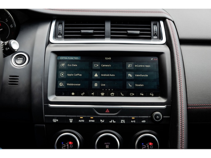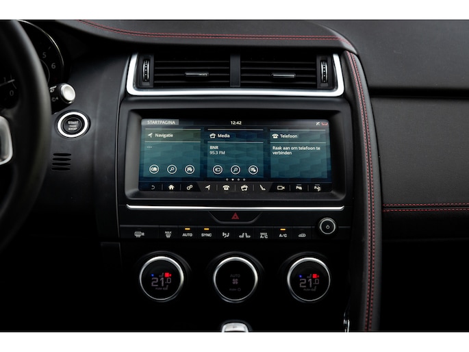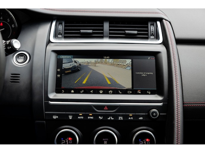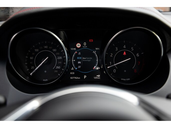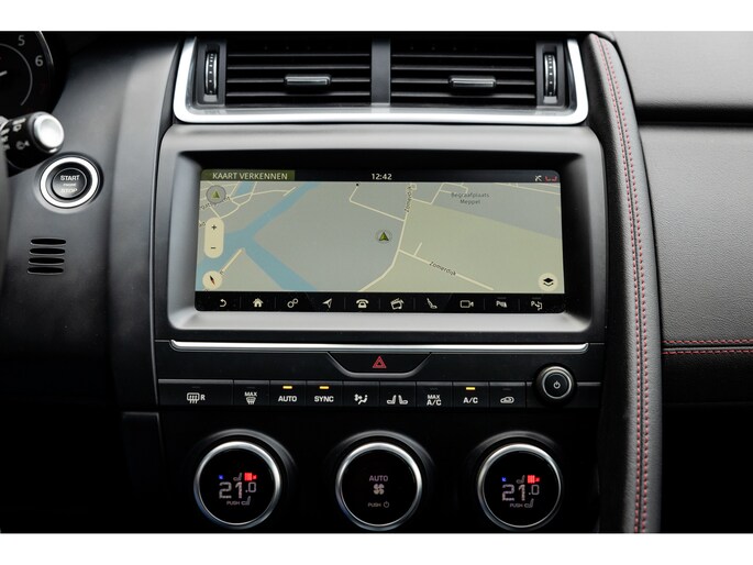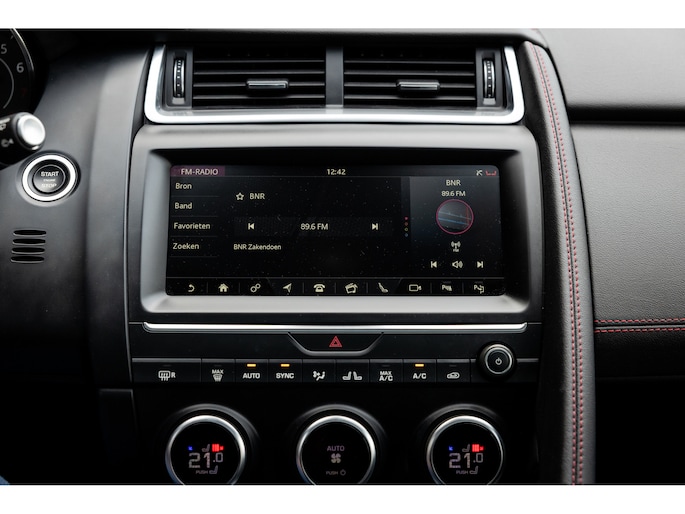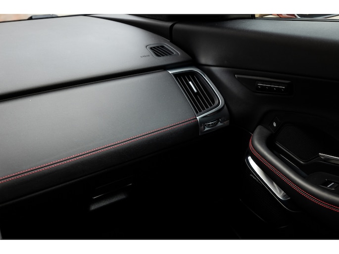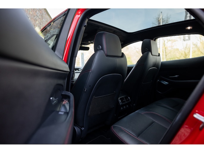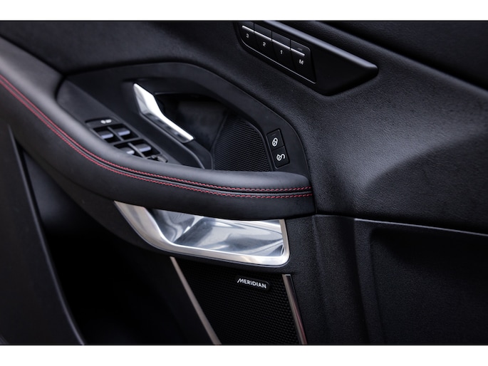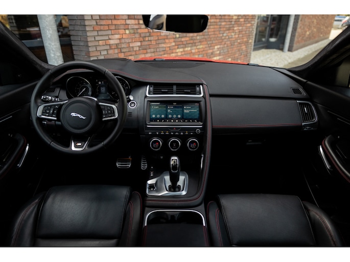 Ook binnenin de E-Pace is de samenstelling perfect. De 18-voudige elektrisch bediende sportstoelen zijn bekleed met luxe leder in Ebony en afgewerkt met rode stiksels. Ook de middenconsole en het dashboard zijn hiermee bekleed en ook hier komen de prachtige rode stiksels weer terug. De stoelen zijn beide voorzien van memorystanden en uiteraard stoelverwarming. Boven je prijkt het glazen panoramadak met elektrisch zonnegordijn. De hemelbekleding is uitgevoerd in zwart alcantara. Echt prachtig en uniek op de E-Pace.