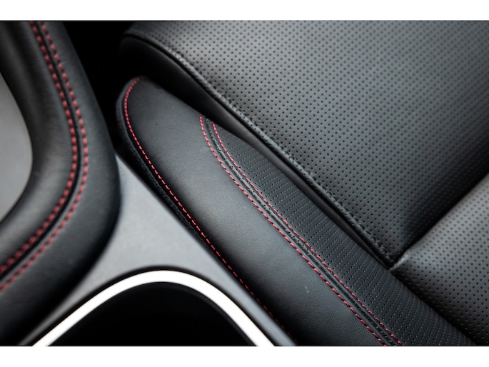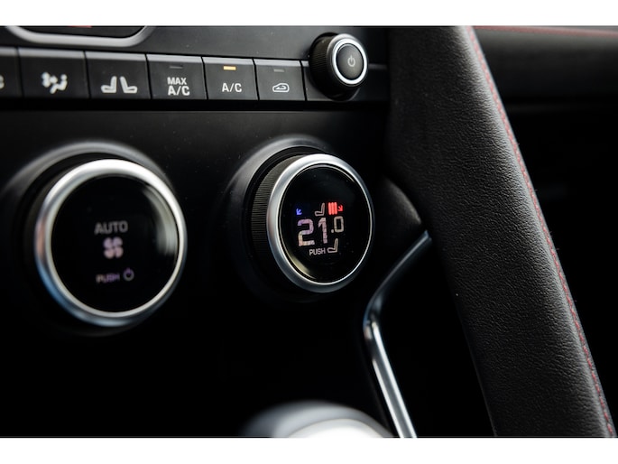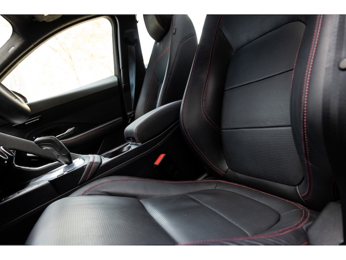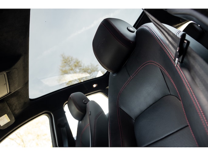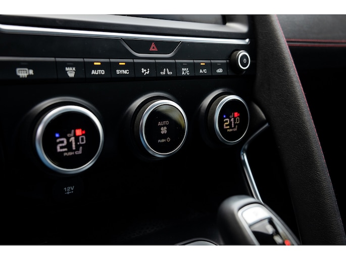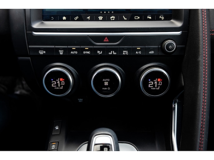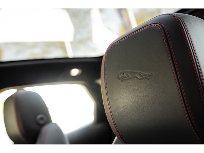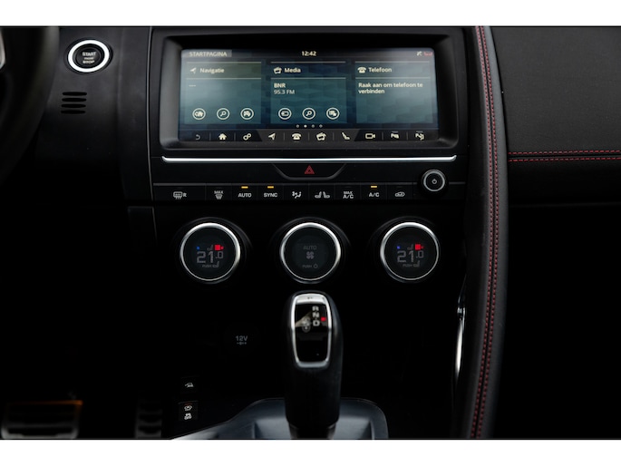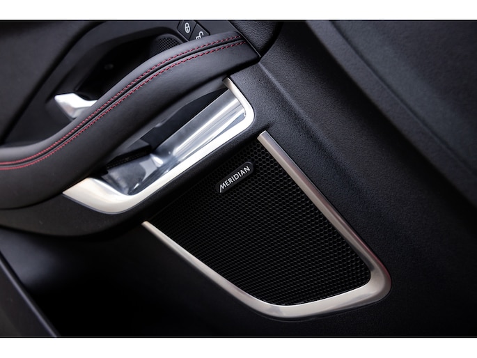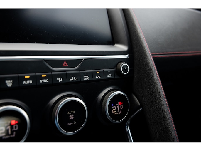 Ook binnenin de E-Pace is de samenstelling perfect. De 18-voudige elektrisch bediende sportstoelen zijn bekleed met luxe leder in Ebony en afgewerkt met rode stiksels. Ook de middenconsole en het dashboard zijn hiermee bekleed en ook hier komen de prachtige rode stiksels weer terug. De stoelen zijn beide voorzien van memorystanden en uiteraard stoelverwarming. Boven je prijkt het glazen panoramadak met elektrisch zonnegordijn. De hemelbekleding is uitgevoerd in zwart alcantara. Echt prachtig en uniek op de E-Pace.