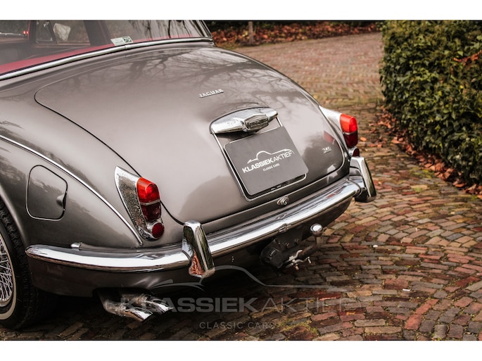 This Jaguar MK2 340, produced in 1967, was originally delivered in the United Kingdom and arrived in the Netherlands in 1993. Various historical documents, both from England and the Netherlands, are also included with this car. The Jaguar MK2 features a stylish mid-grey metallic finish with a beautiful red leather interior. In our opinion, the perfect color combination. The bodywork is in reasonably good condition, although some signs of age are visible in several places. The chrome is also generally in good condition, with some signs of age visible on some chrome and trim parts. This also applies to the various rubber parts and finishes. The stylish spoke wheels are a beautiful combination with this stunning body color.