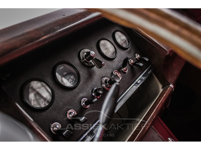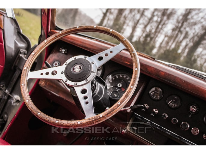 The red leather interior is still in exceptionally good condition. The seats and rear bench are not only comfortable but also in good condition. The woodwork is in reasonable condition and shows signs of patina. The gauges and instruments are in good, attractive condition. The headliner is still original and in good condition.