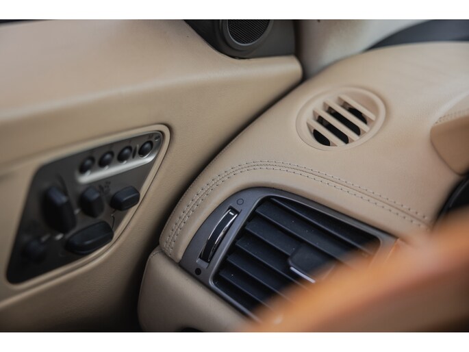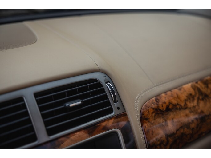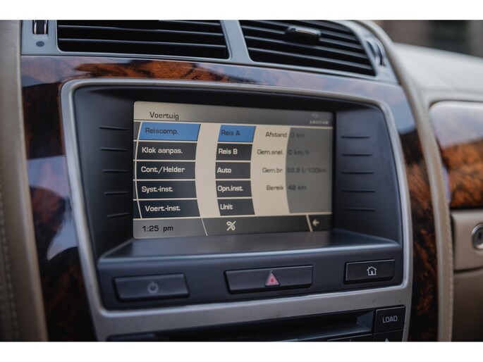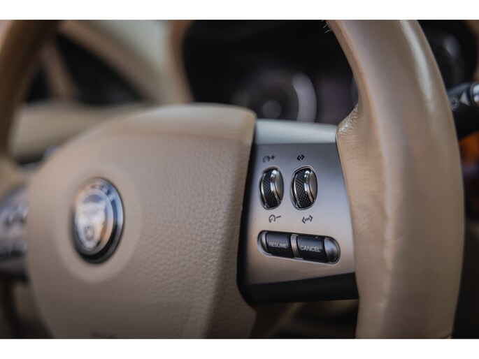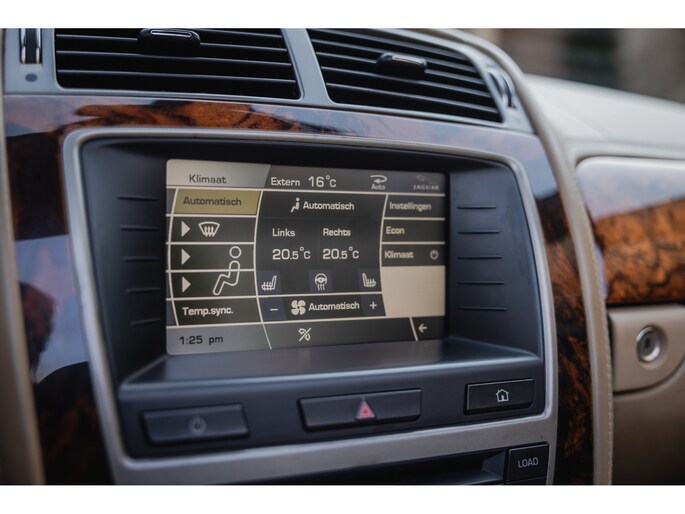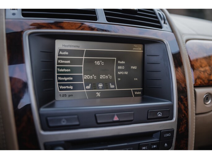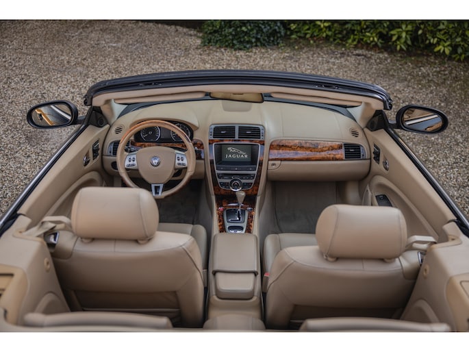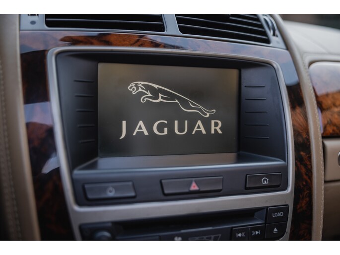 Zoals het een Brit betaamt is het interieur rijkelijk voorzien van leder en houten sierlijsten. In de XK is dat niet anders. De zetels, het dashboard, alles is bekleed in prachtig leder en gecombineerd met chique sierlijsten. Luxe alom. Besef dat de XK inmiddels 20 jaar oud is en dan zulke opties kende. Zo zijn de stoelen volledig elektrische verstelbaar en voorzien van memorystanden en uiteraard beschikken ze over stoelverwarming. Overigens is ook het stuurwiel elektrisch verstelbaar en te verwarmen. In het midden prijkt het grote scherm van het multimediasysteem. Het betreft een touchscreen en het beschikt over klimaatinstelling, bluetooth, navigatie, en audio. Dat laatste werd verzorgd door Alpine. Het Dolby Surround ProLogic systeem levert maar liefst 525W. Het stuurwiel is voorzien van de bedieningsknoppen. Hier vind je ook de bedienen van de adaptieve cruise control. Een bijzondere optie in die tijd. De auto houdt middels radartechniek zelf afstand tot de voorligger. Verder uiteraard dual zone climate control, voorruitverwarming, key-less en de softtop is elektrisch bediend. Dit laatste kan zelfs rijdend tot een bepaalde snelheid. Heel fraai zijn de koplampen met xenon verlichting.
