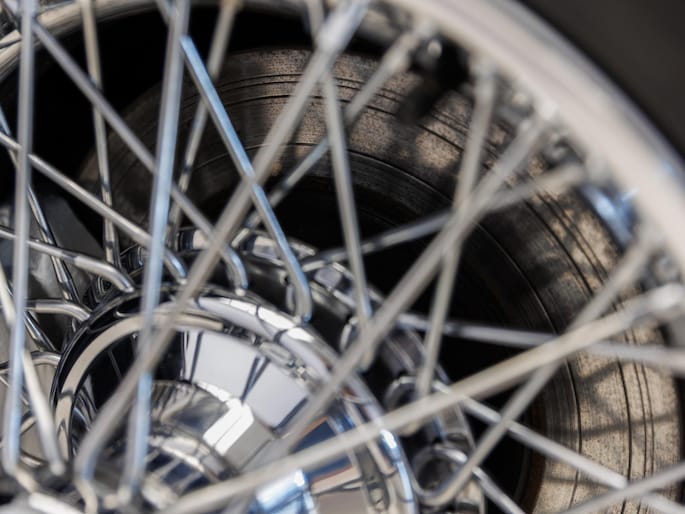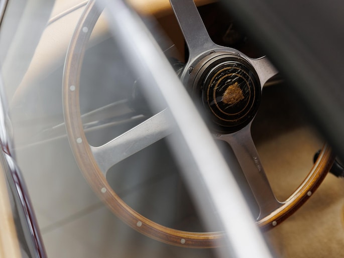 Stuur is vervangen door een Motolita, passend bij het karakter van de auto. Velgen met het originele aantal spaken, in lijn met de periode waarin de auto gebouwd is.