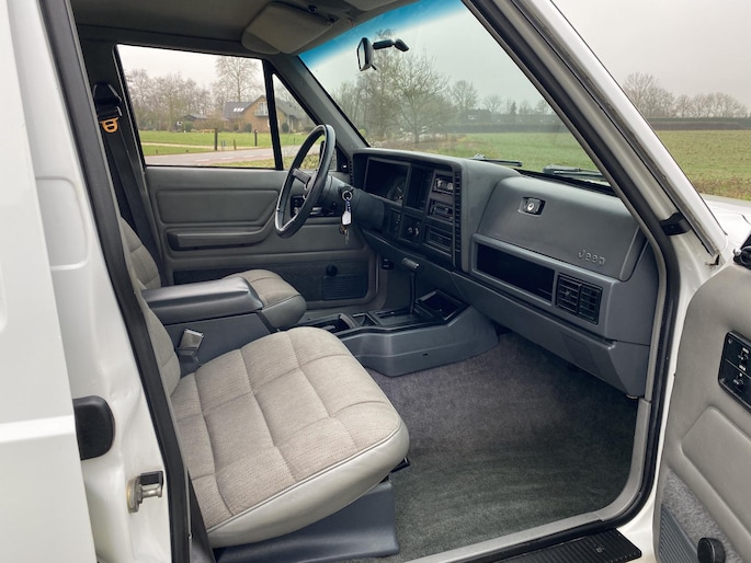 Wij hebben een stoere Jeep Cherokee classic te koop in het wit met een grijs stoffen interieur uit 1994.