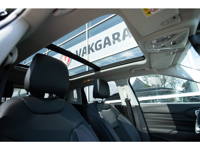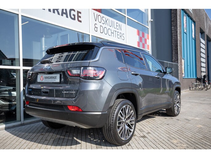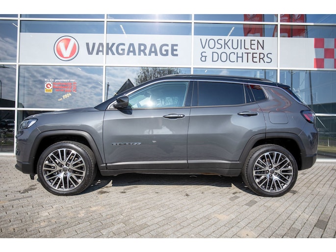 Deze Jeep Compass 4xe PHEV in de luxe Limited uitvoering combineert stijl, comfort en moderne techniek op een unieke manier. De auto is uitgevoerd met een contrasterend zwart dak en verfijnde chromen accenten, wat zorgt voor een elegante en sportieve uitstraling. Het panoramadak geeft het interieur een ruimtelijk en licht gevoel, terwijl de half lederen stoelen met elektrisch verstelbare lendesteunen garant staan voor optimaal zitcomfort, ook tijdens langere ritten.