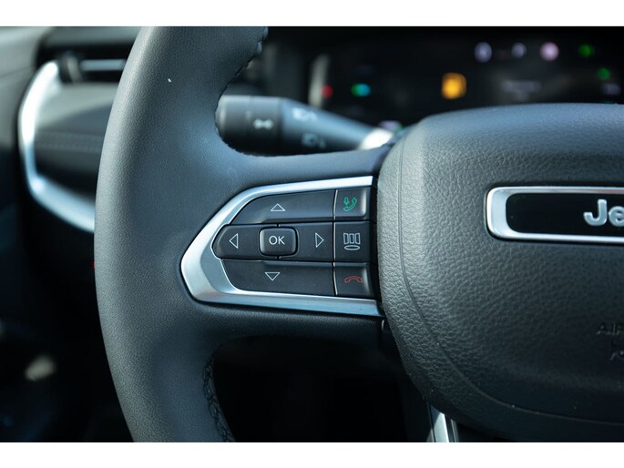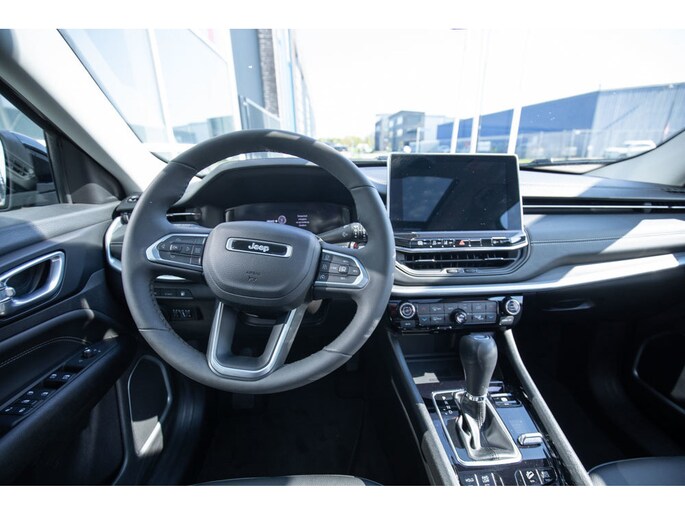 This Jeep Compass 4xe in the luxurious Limited trim combines style, comfort, and modern technology in a unique way. The car features a contrasting black roof and refined chrome accents, giving it an elegant and sporty look. The panoramic sunroof creates a spacious and airy feel inside, while the semi-leather seats with power-adjustable lumbar supports ensure optimal seating comfort, even on longer drives.