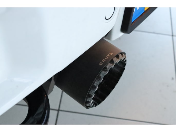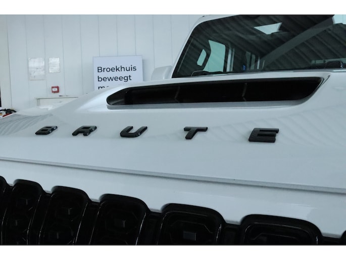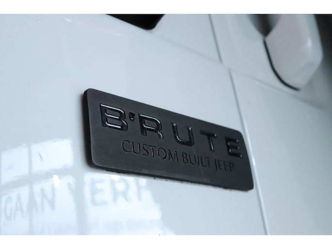 Het BRUTE pakket geeft de Wrangler een krachtigere en verfijndere uitstraling. De sportieve motorkap met luchtinlaat, de aangepaste voorbumper, diffuser met extra luchtuitlaten en de sportuitlaat benadrukken het dynamische karakter. De carrosserie is uitgevoerd in hoogglans wit, waarbij alle kunststof delen in carrosseriekleur zijn meegespoten en gecombineerd met hoogglans zwarte accenten voor een hoogwaardige en exclusieve afwerking. De 20 inch zwarte lichtmetalen velgen met offroad banden, samen met de elektrisch inklapbare side steps, maken het geheel compleet en zorgen voor een robuuste maar stijlvolle uitstraling.