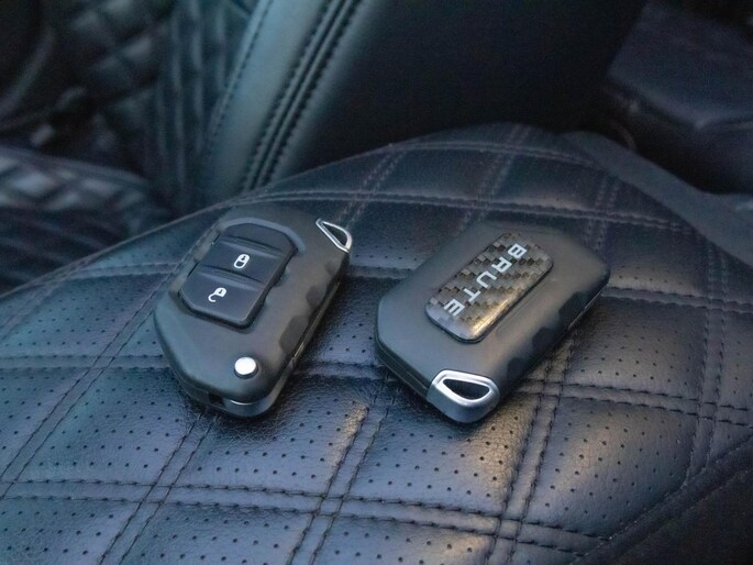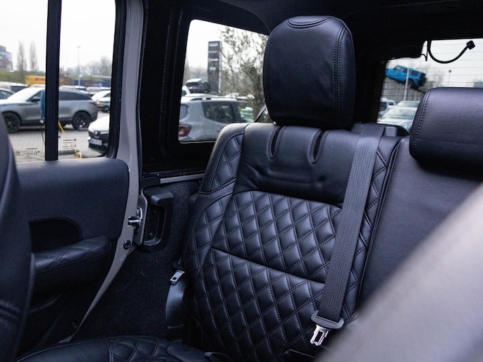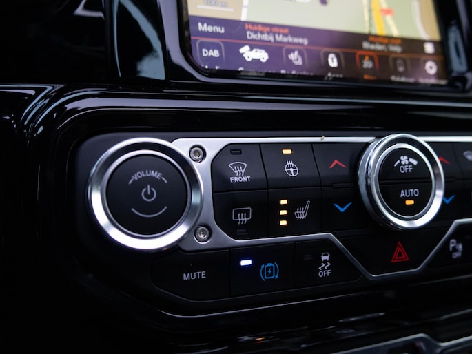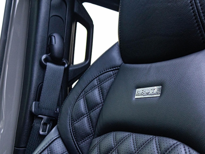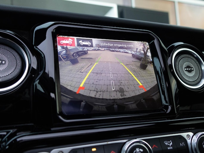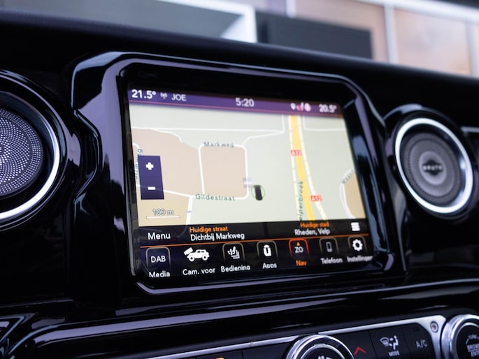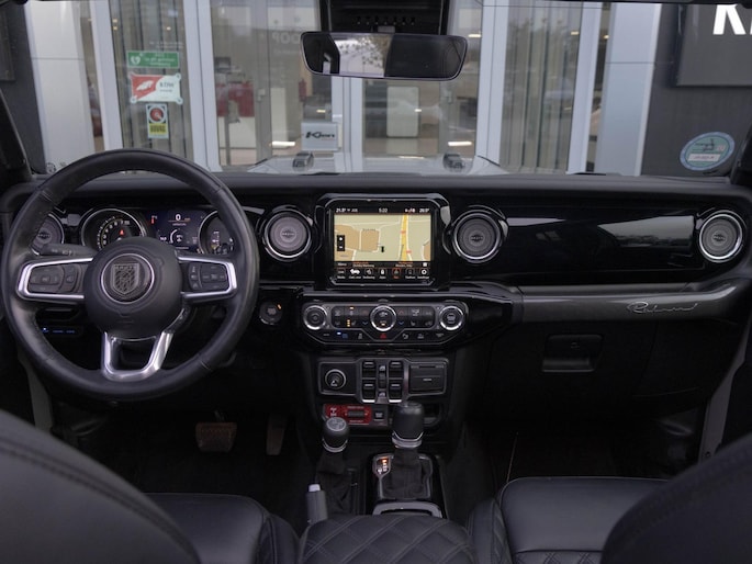 Het interieur is uitgevoerd met luxe Brute Richmond bekleding met diamantstiksel, wat direct een premium sfeer creëert. Het panoramische sun roof geeft een open rijbeleving, terwijl moderne technologie zoals navigatie, Apple CarPlay, Android Auto en diverse rijhulpsystemen zorgen voor comfort en gebruiksgemak. De performance uitlaat zorgt bovendien voor een krachtig geluid dat perfect past bij het karakter van deze Jeep.