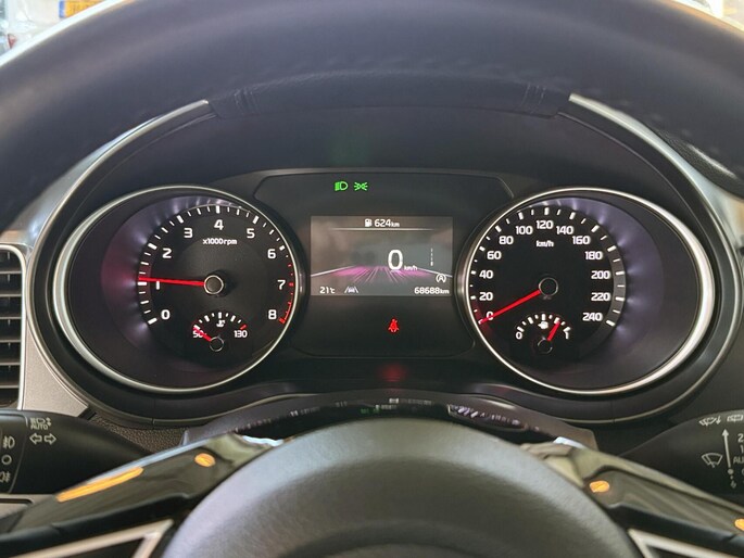 Ongelukken of parkeerschade? Dat gebeurt u niet meer, met de achteruitrijcamera. Kilometerstand? Oliepeil? Accuspanning? Allemaal te zien via de app. Overal. Altijd. Dankzij Connected Services. Het full map navigatiesysteem en het audiosysteem (met DAB-ontvangst!) bedient u met knoppen op het stuur of met gesproken commando's. Het comfort wordt verhoogd door de aanwezige electronic climate control. Het drukke verkeer eist onderweg al uw aandacht op. Daarom is het goed dat deze Kia is voorzien van diverse systemen die u assisteren tijdens de rit. Een automatisch inschakelbare verlichting neemt het waar als het donker wordt of gaat schemeren, en schakelt dan automatisch de verlichting in. Op dezelfde manier "ziet" de regensensor de eerste spatjes regen en schakelt dan de ruitenwissers in, en als het harder gaat regenen zet hij de ruitenwissers ook in een snellere stand. De Kia is standaard voorzien van: cruise control, automatisch dimmende binnenspiegel, lederen stuur, isofix-aansluiting, centrale deurvergrendeling met afstandsbediening en lederen versnellingspook.