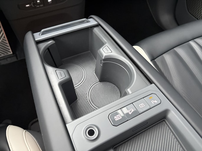 De derde zitrij van de EV9 biedt voldoende ruimte, vooral voor kinderen, en heeft luxe features zoals elektrisch bedienbare rugleuningen, USB C-aansluitingen en bekerhouders.