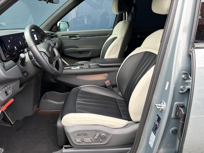 De Kia EV9 is een imposante verschijning. Met een lengte van 5 meter, een breedte van bijna 2 meter en een hoogte van 1,75 meter is de EV9 een indrukwekkende auto. Het uitgerekte EGMP-platform biedt niet alleen ruimte voor een groter accupakket, maar maakt ook een derde zitrij mogelijk, waardoor de EV9 standaard als 7-zitter wordt geleverd.