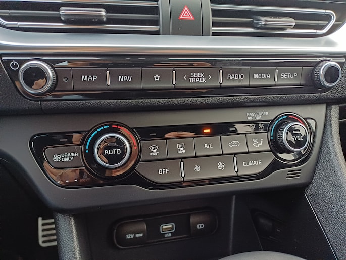 Nooit meer parkeerschade dankzij de achteruitrijcamera. Adaptive cruise control is een comfortabele en veilige optie. Het systeem reguleert de snelheid en houdt automatisch afstand tot uw voorligger. Kies de muziek waarvan u houdt, dankzij de DAB-radio klinkt het altijd geweldig. Intussen bedient u het audiosysteem en het full map navigatiesysteem met de knoppen op het stuur. Met automatische airconditioning hoeft u alleen de gewenste temperatuur in te stellen. Het systeem doet de rest. In deze Kia kunt u zich concentreren op het verkeer, terwijl de auto de omgeving voor u in de gaten houdt. Een automatisch inschakelbare verlichting zorgt dat de verlichting aangaat als het donkerder wordt - in tunnels bijvoorbeeld - en de regensensor schakelt de ruitenwissers in als het nodig is. U hoeft er niets aan te doen. Ook schakelpaddles aan het stuur, keyless entry, automatisch dimmende binnenspiegel, bagage afdekhoes en lederen versnellingspook zijn aan boord.