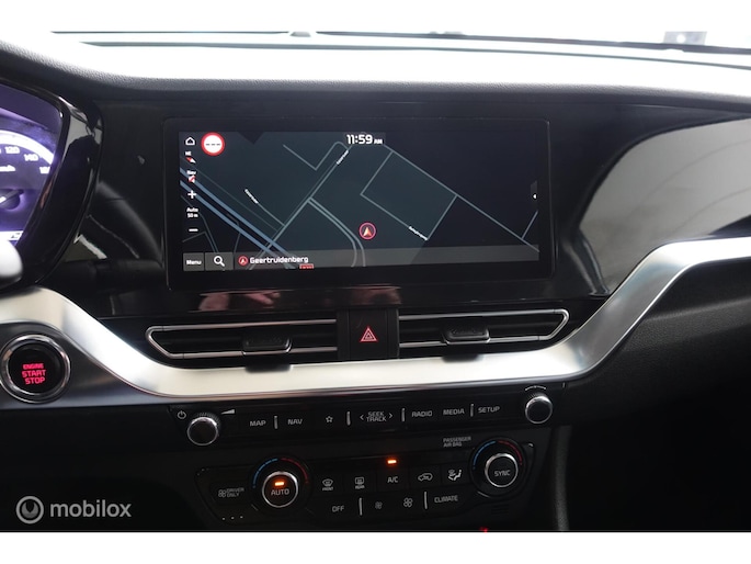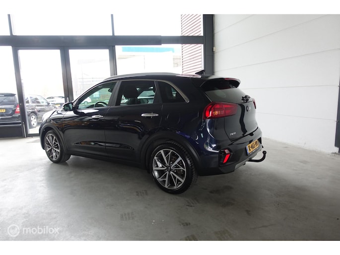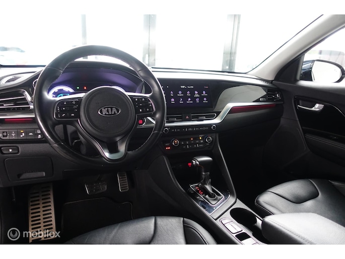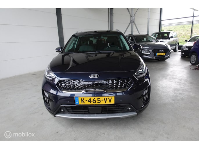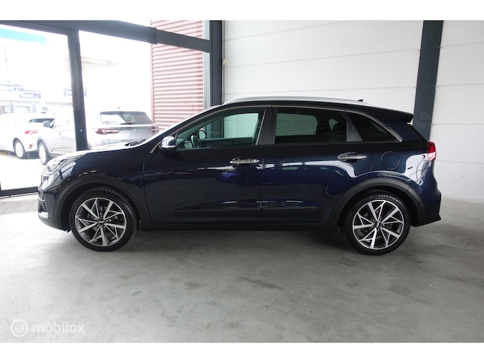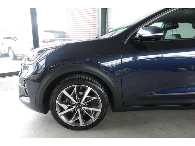 Superluxe Niro met volledig lederen bekleding, 18 inch lichtmetalen velgen, dodehoek waarschuwing enzovoort. In de kleur bijnazwartdonkerblauwmetallic.
