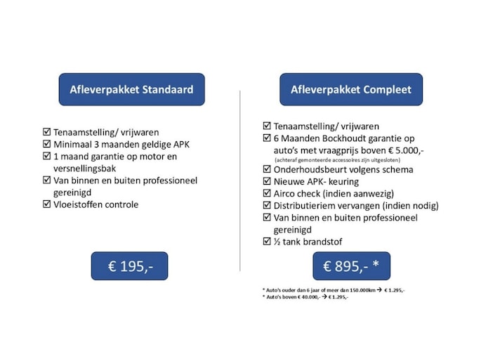 * Auto’s ouder dan 6 jaar of meer dan 150.000 km --> € 1.295,-